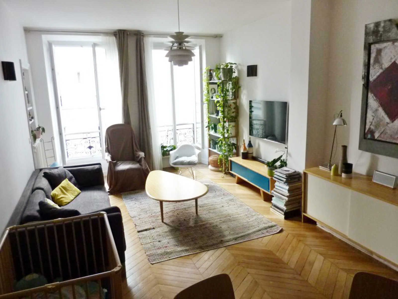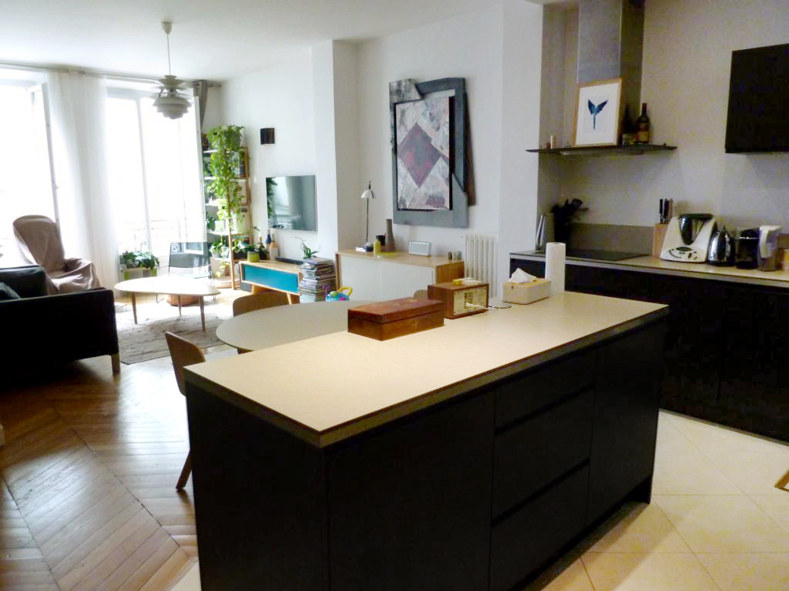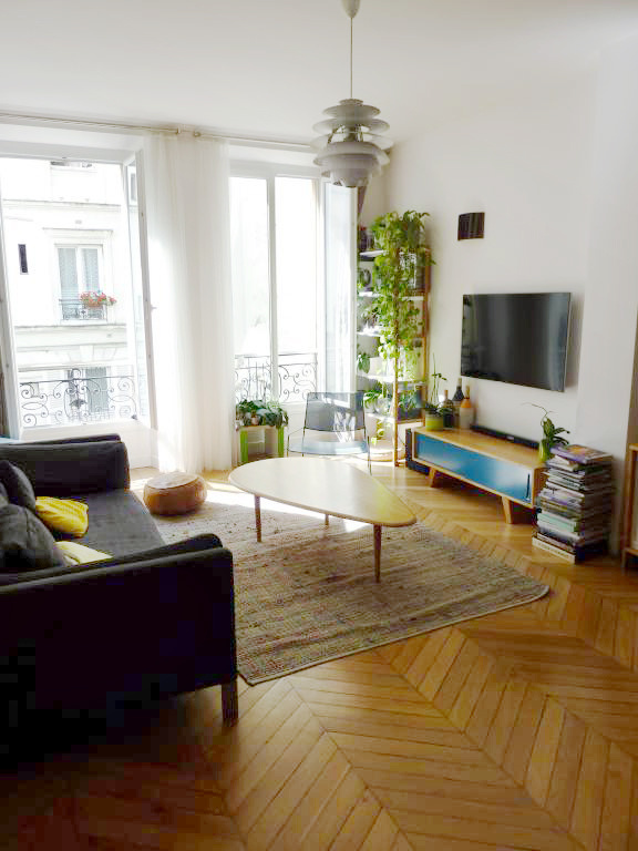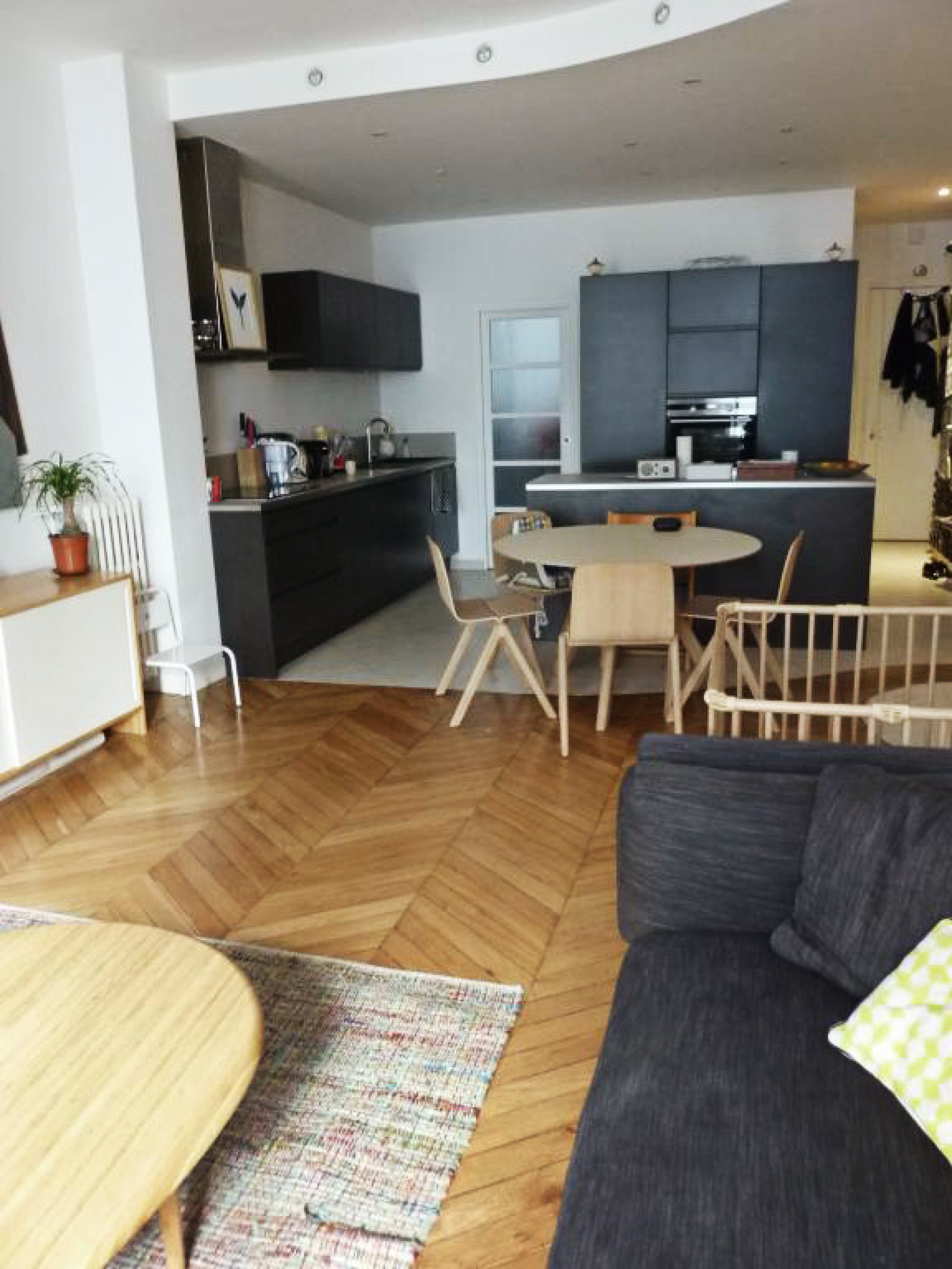 Il est en parfait état avec des prestations haut de gamme en termes de confort. Il possède du ccachet avec une belle hauteur sous plafond de presque 3 mètres et du parquet ancien en point de Hongrie.