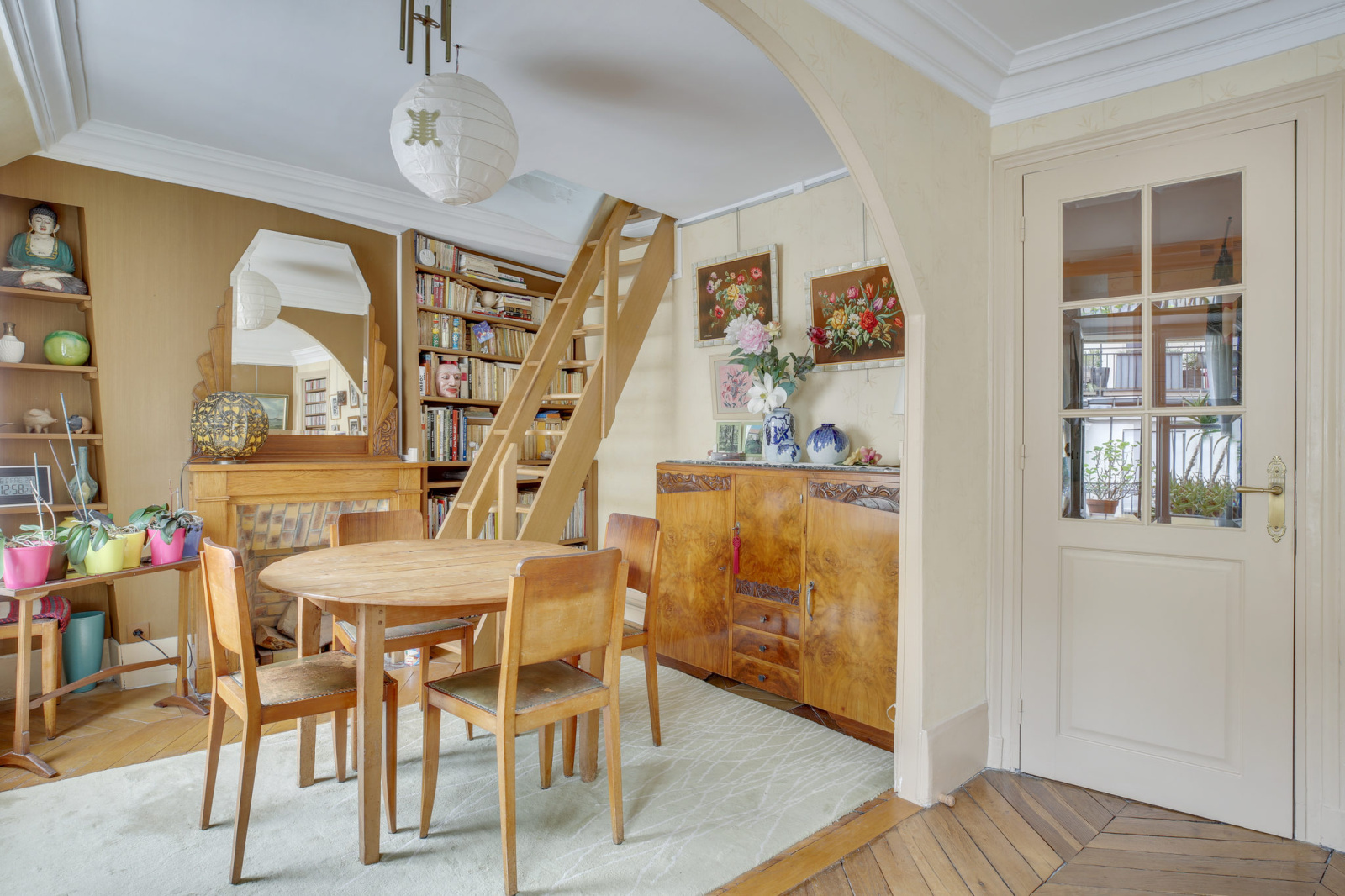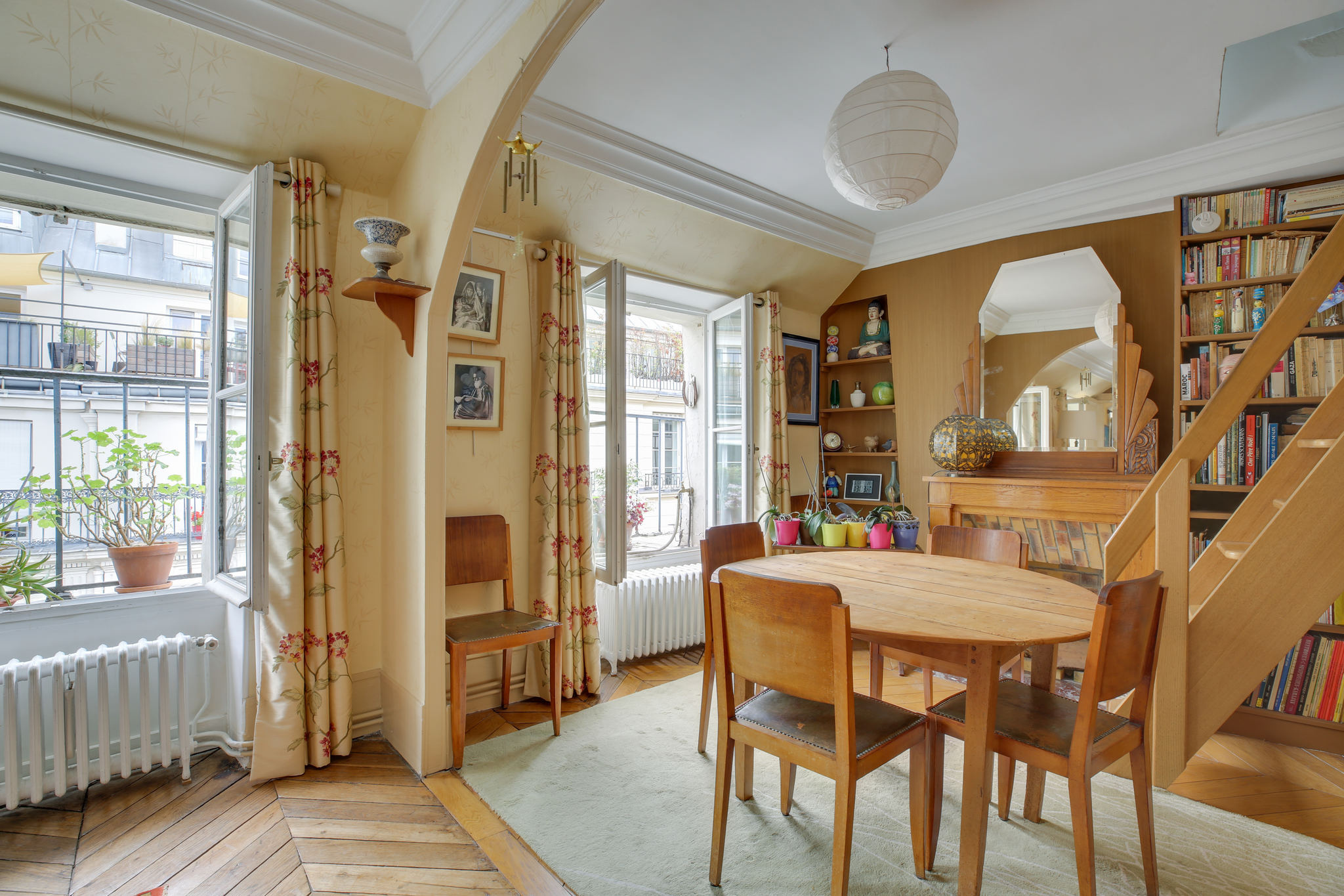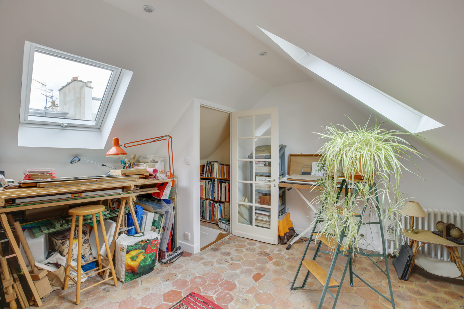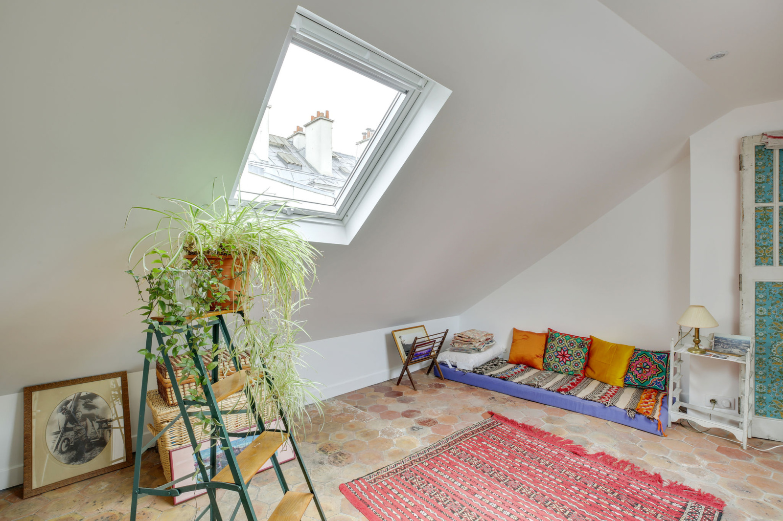 Balcon filant et vue ciel pour ce duplex atypique de 67,20 m2 selon la loi carrez et 82m2 au sol situé au 5ème étage dans un bel immeuble Pierre de Taille avec gardien du 18ème.