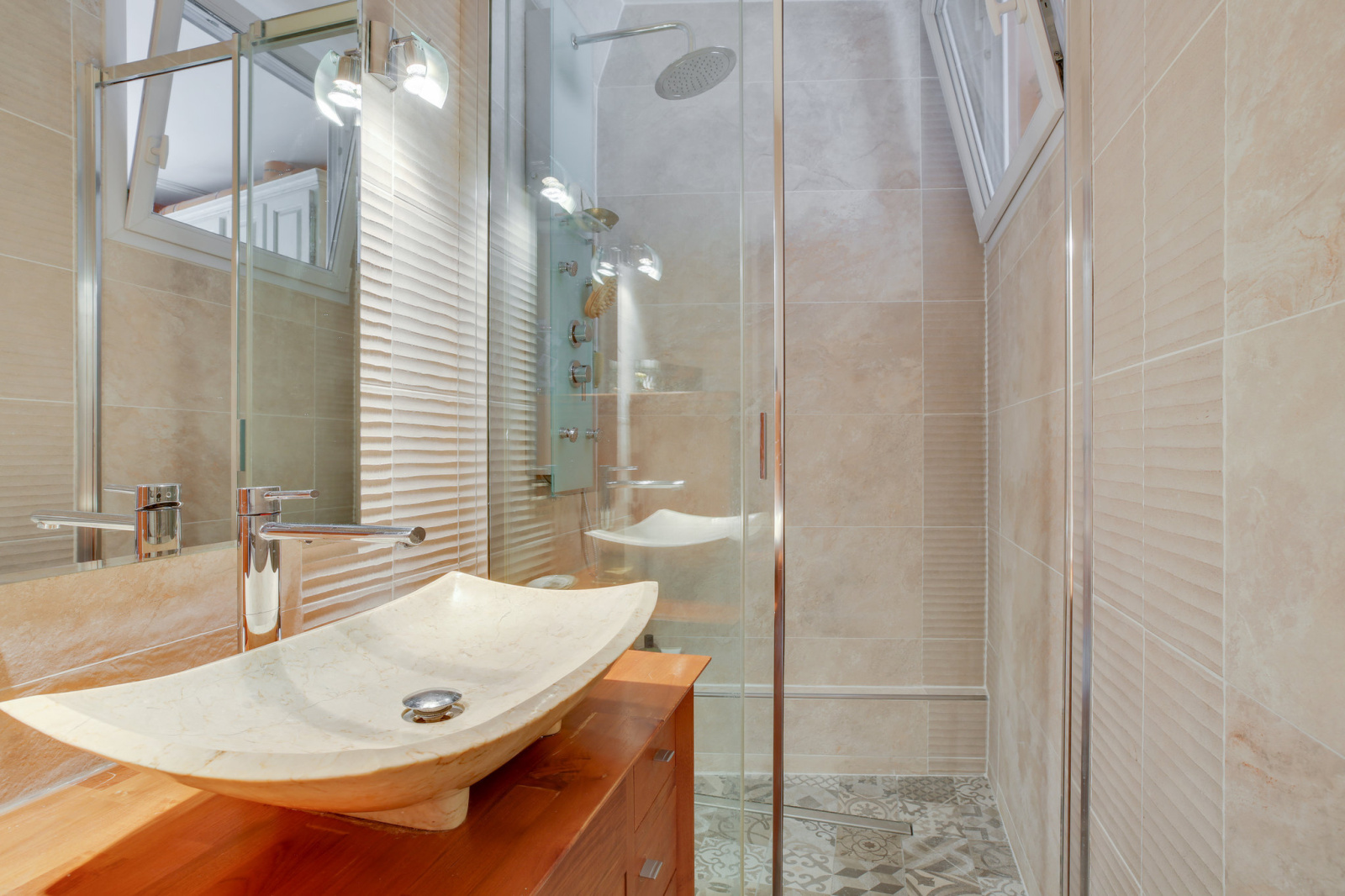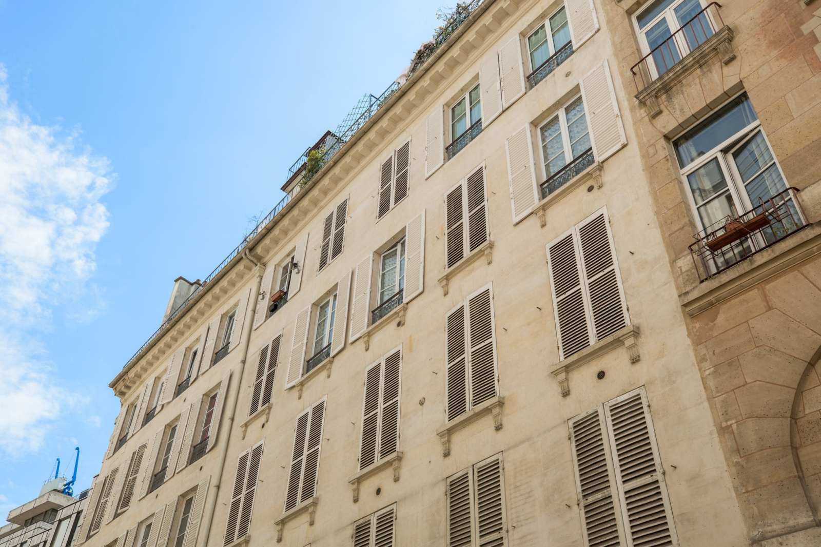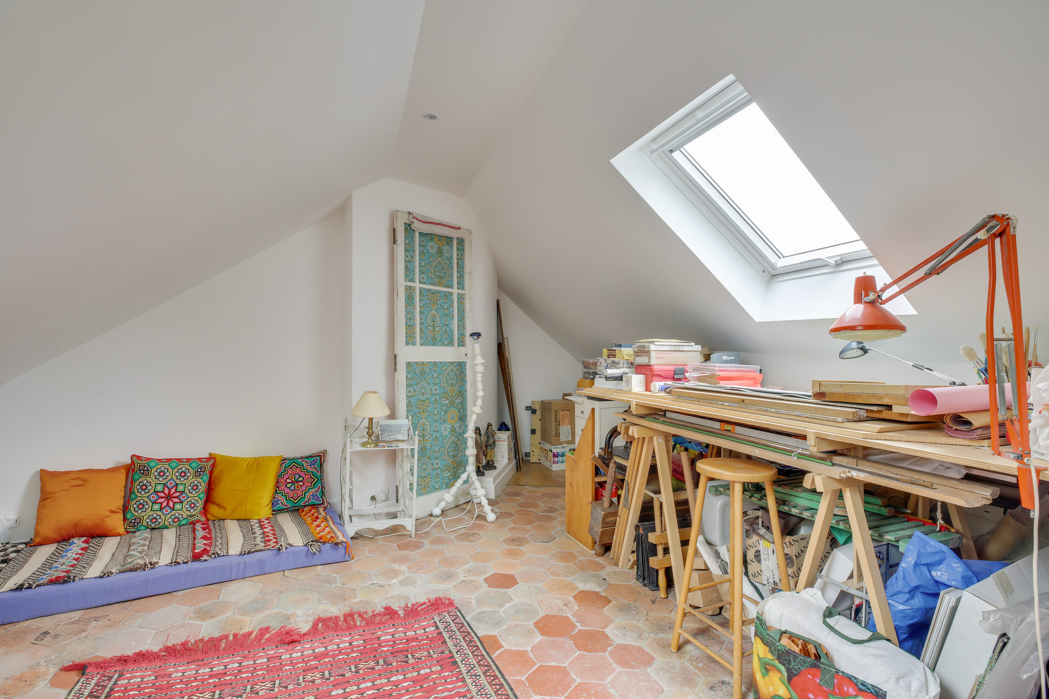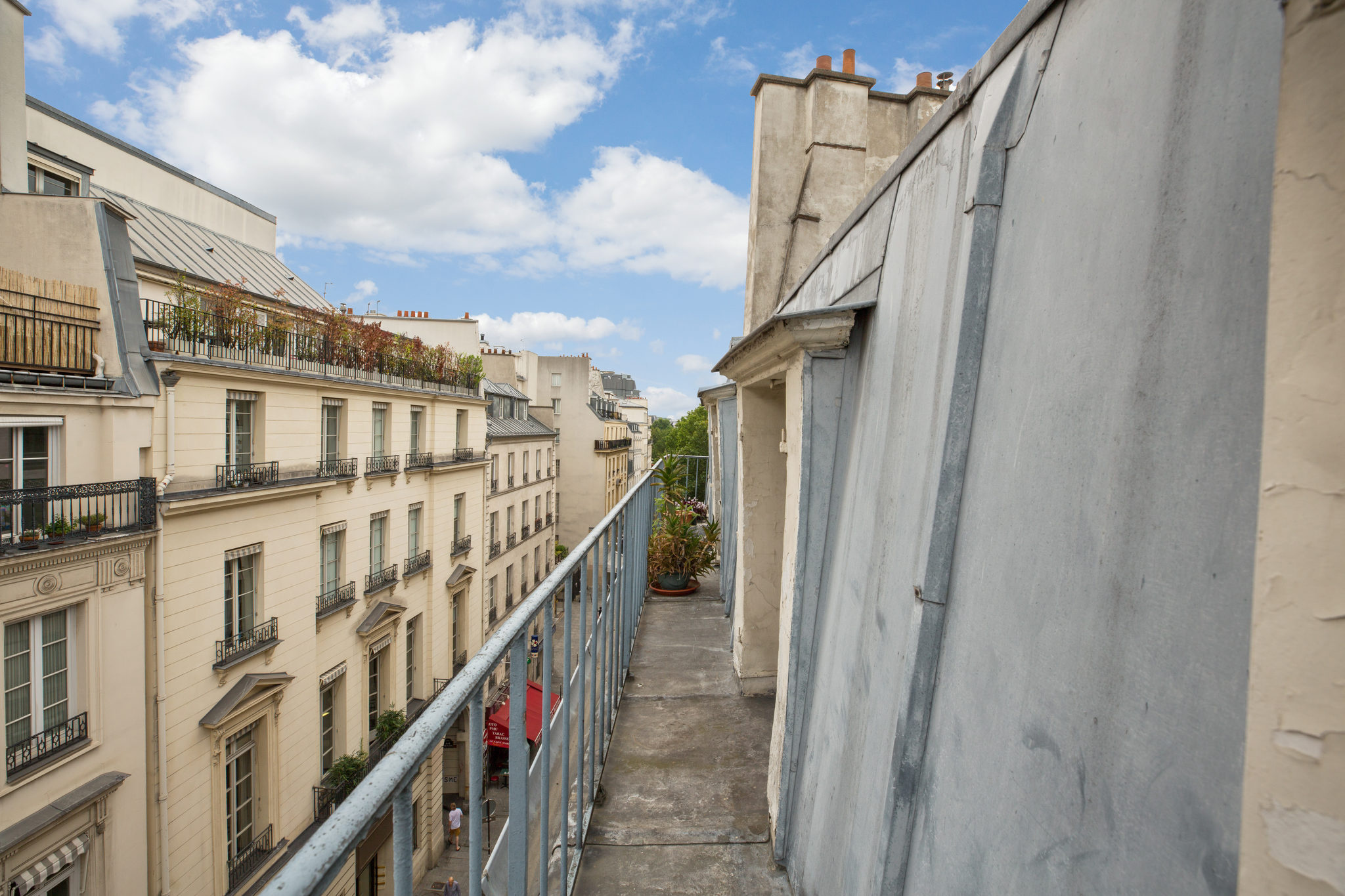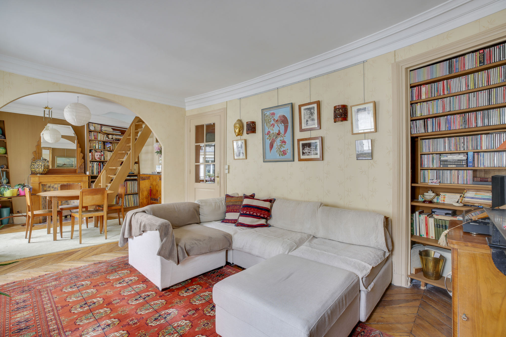 Balcon filant et vue ciel pour ce duplex atypique de 67,20 m2 selon la loi carrez et 82m2 au sol situé au 5ème étage dans un bel immeuble Pierre de Taille avec gardien du 18ème.