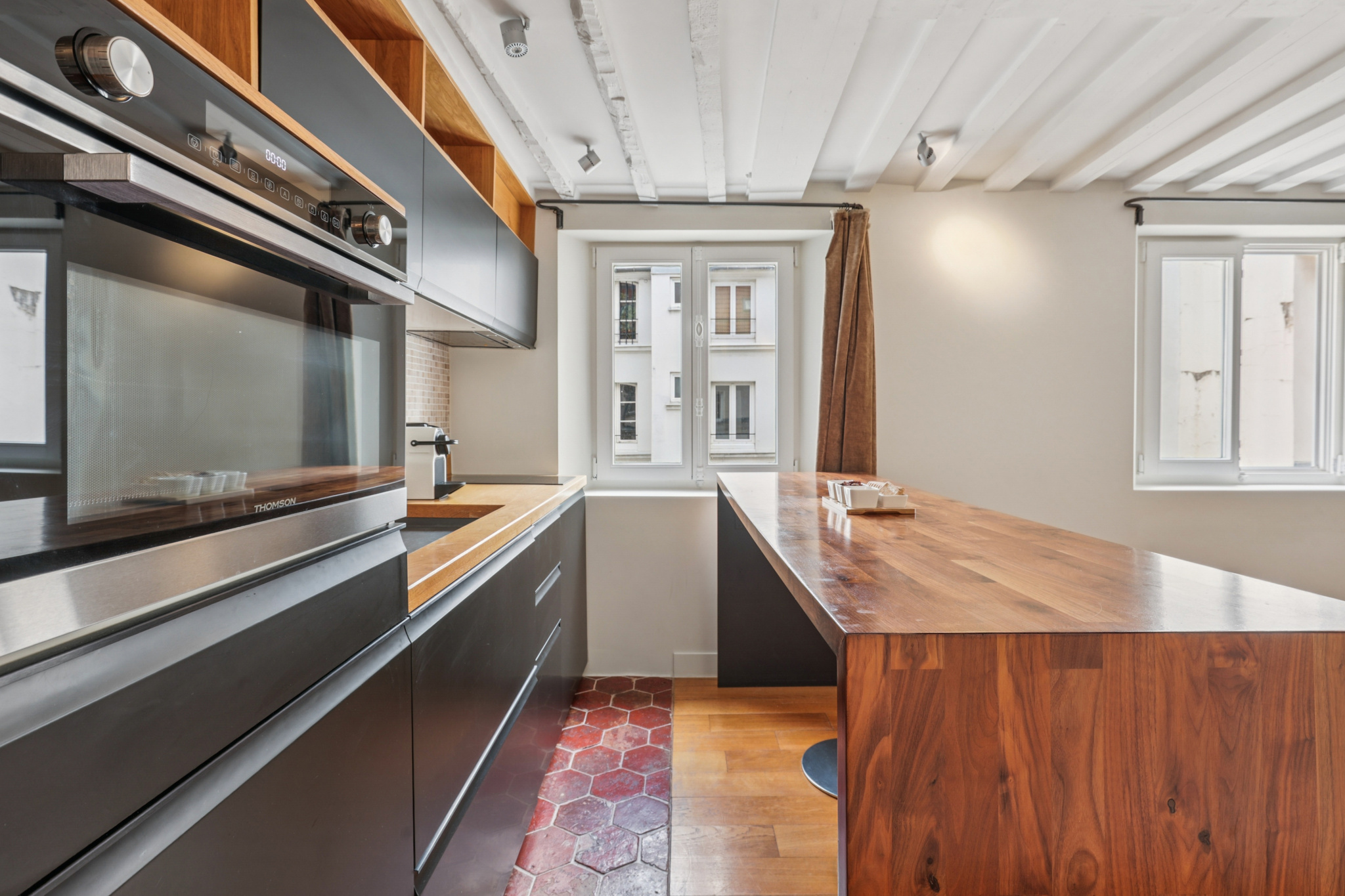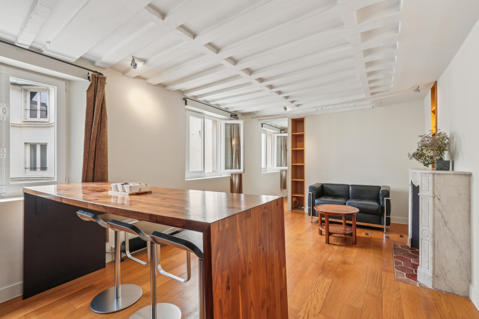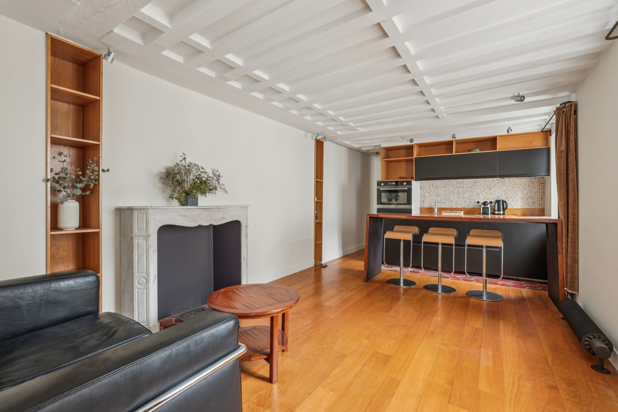 Rénové avec soin et raffinement, l’appartement mêle parquet en bois massif, poutres apparentes, cheminée à l’éthanol, rangements intégrés sur mesure, radiateurs design et belle cuisine entièrement équipée.