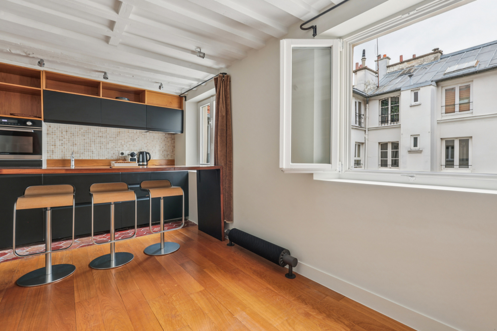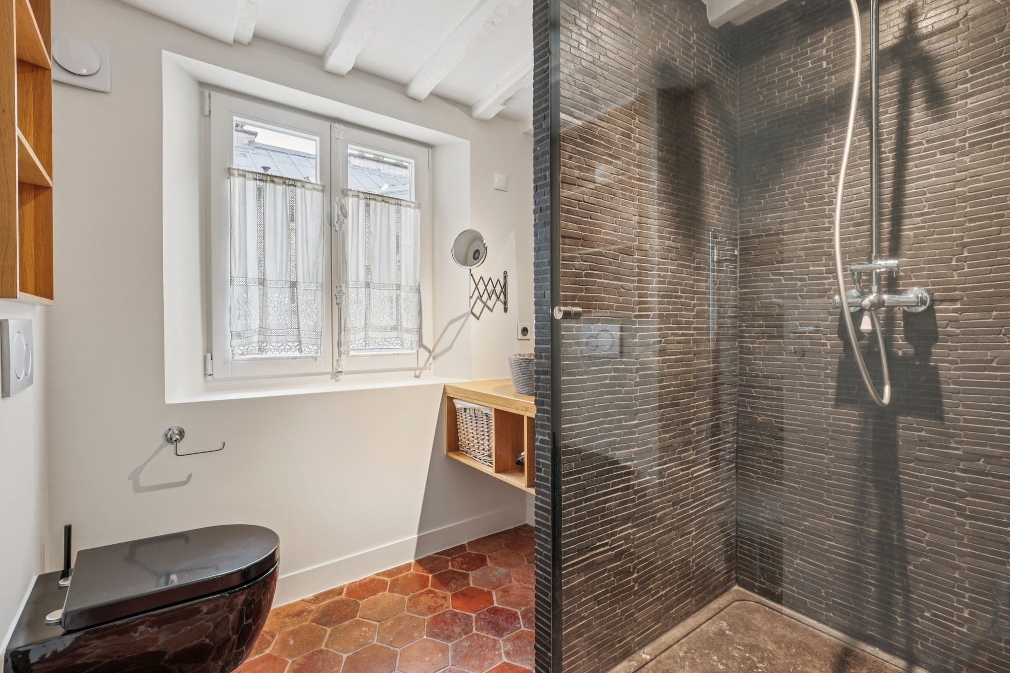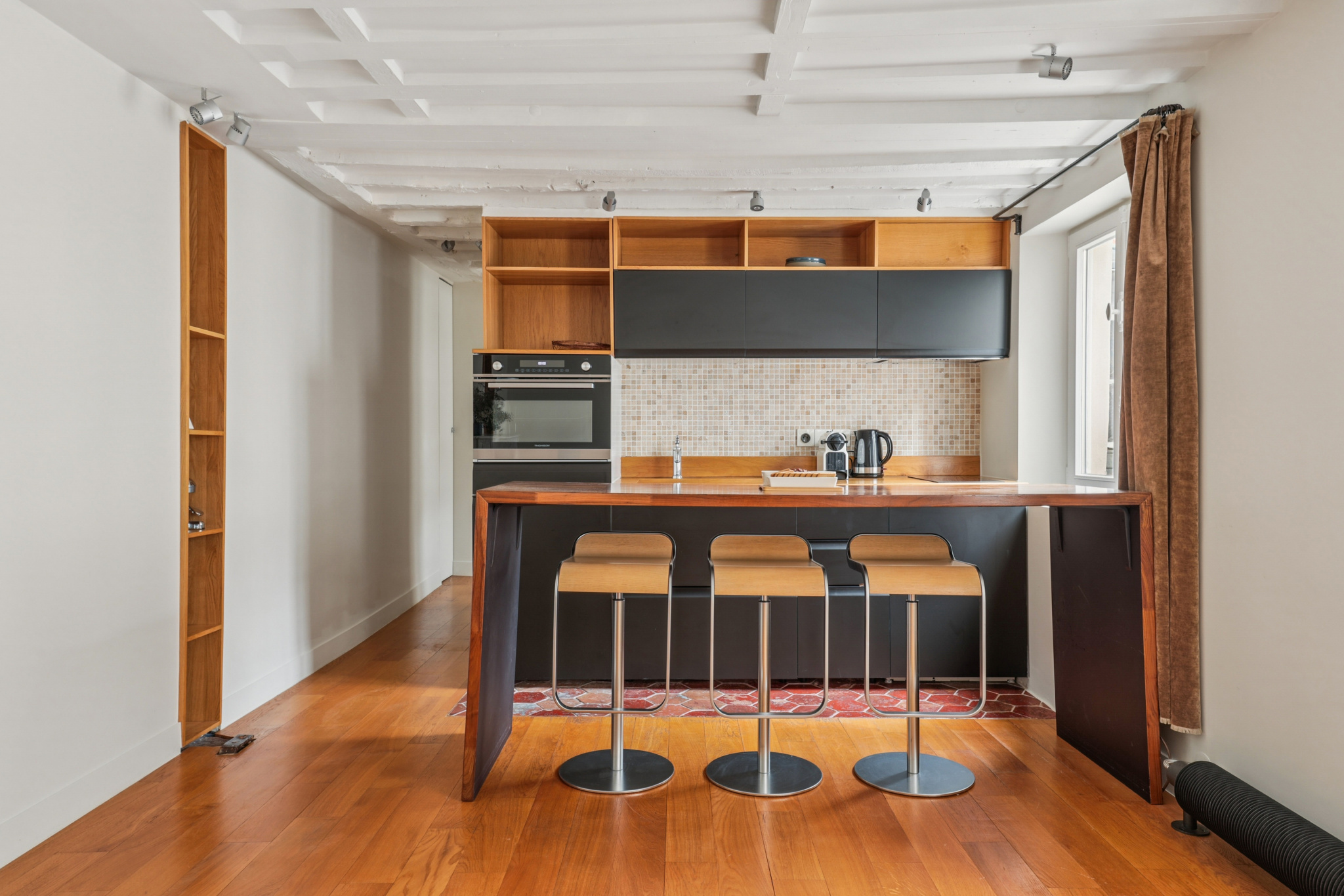 Rénové avec soin et raffinement, l’appartement mêle parquet en bois massif, poutres apparentes, cheminée à l’éthanol, rangements intégrés sur mesure, radiateurs design et belle cuisine entièrement équipée.