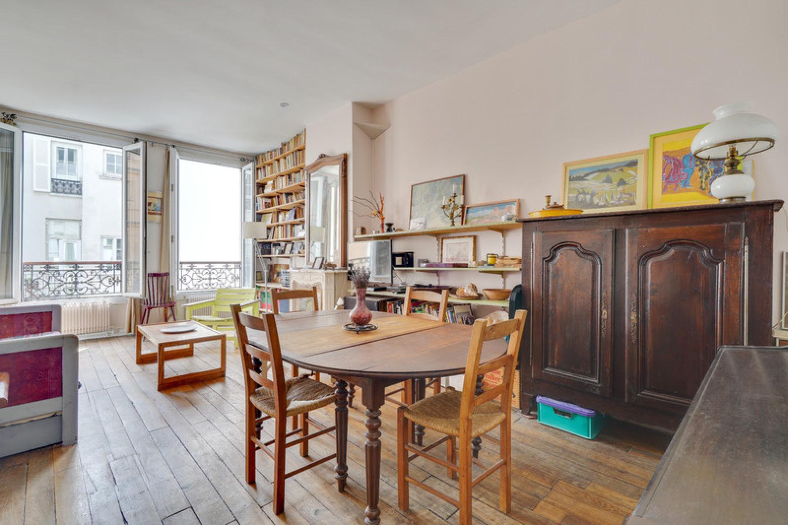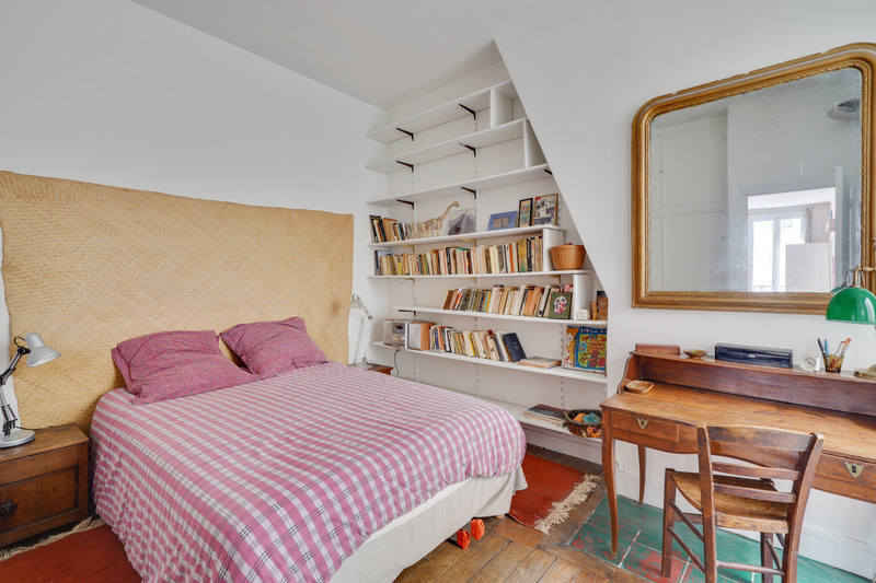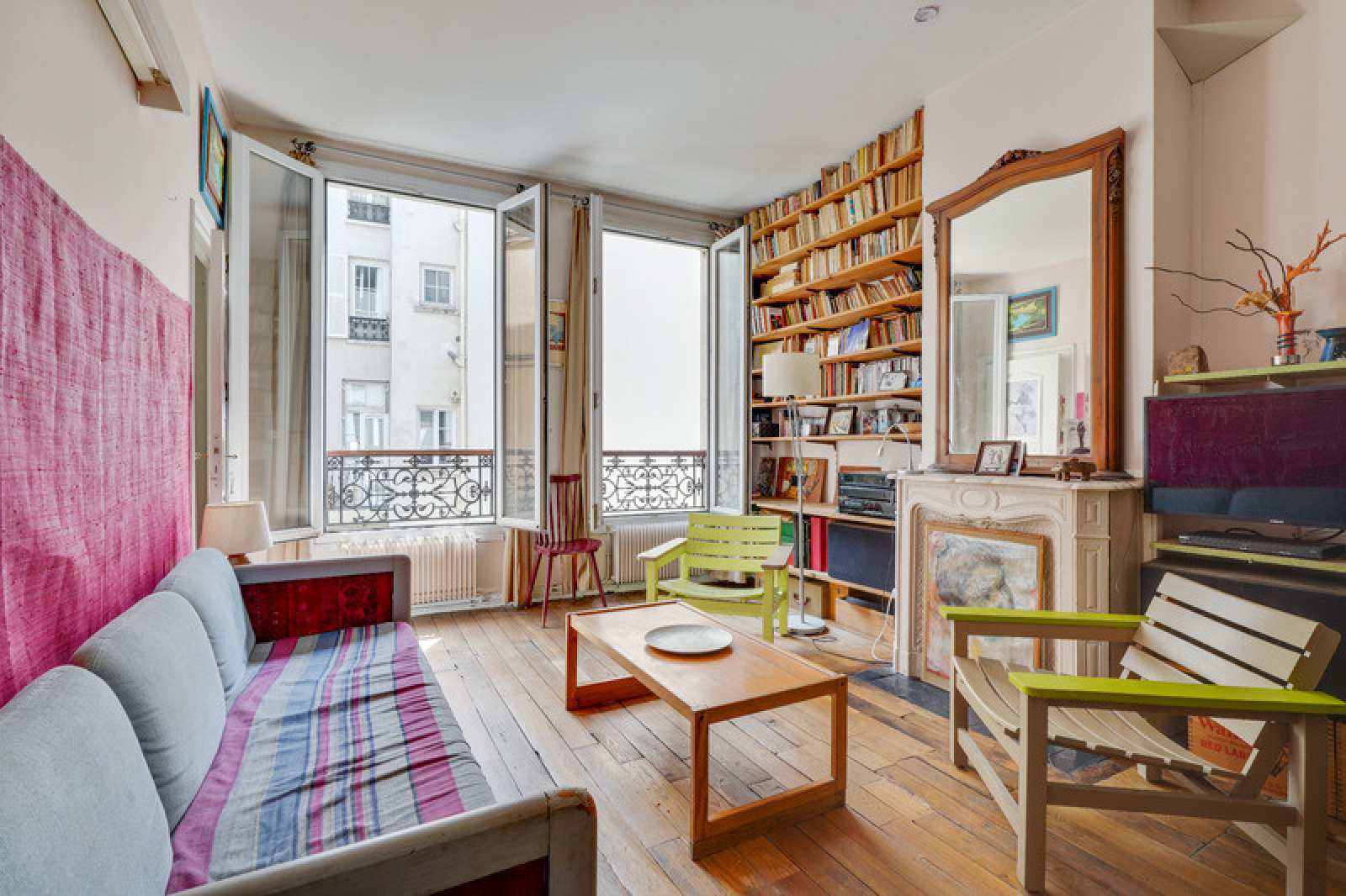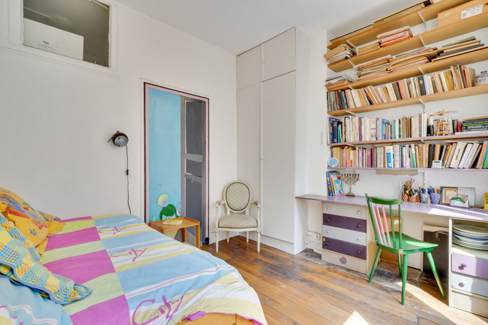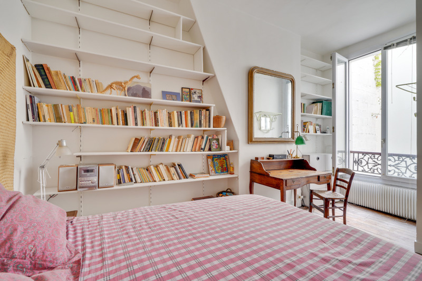 Cette chambre possède une grande fenêtre sur une courette.