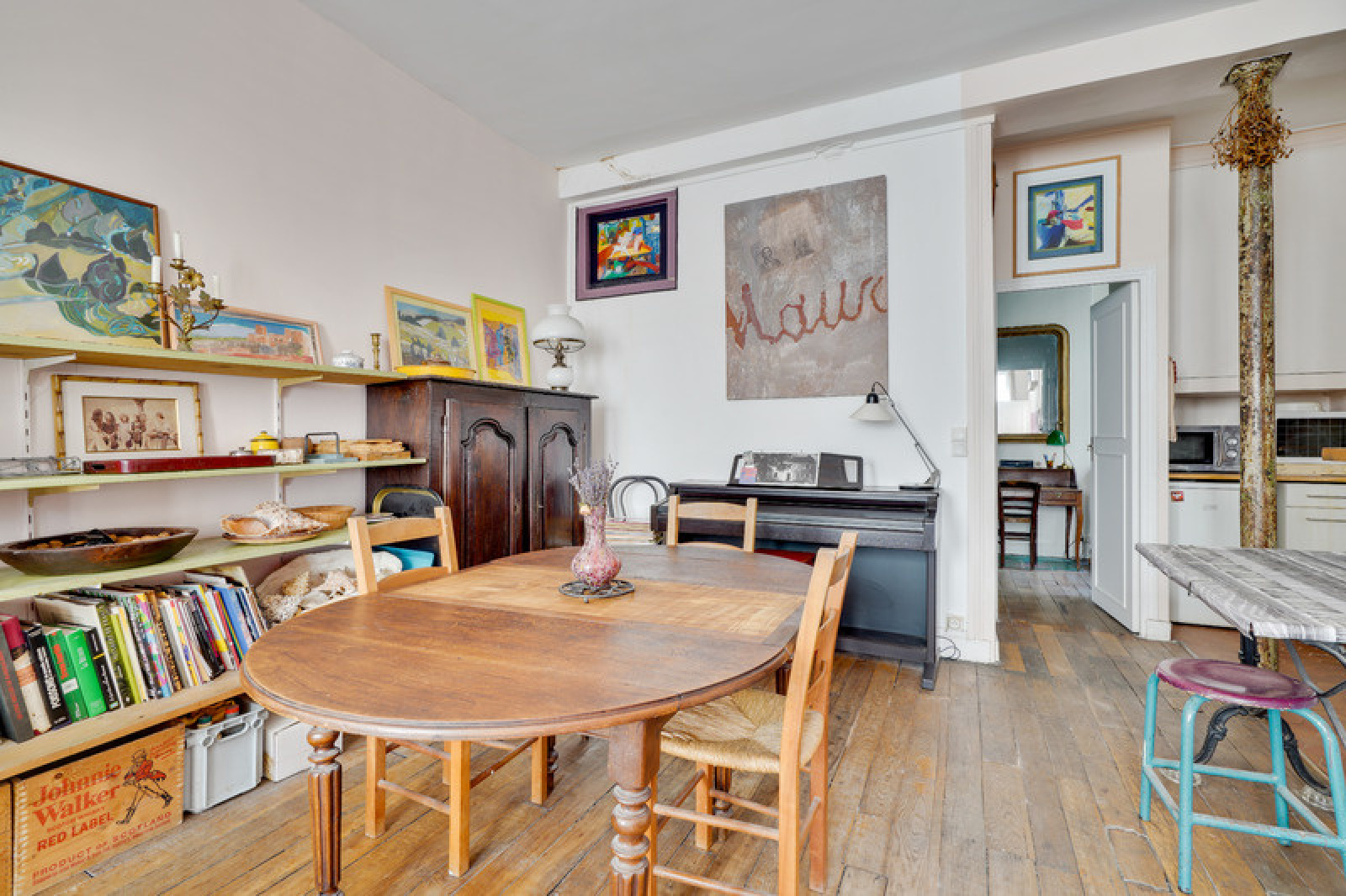Ce vaste séjour lumineux comprend également un coin cuisine. La cuisine nécessitera des travaux de rafraichissement / modernisation.