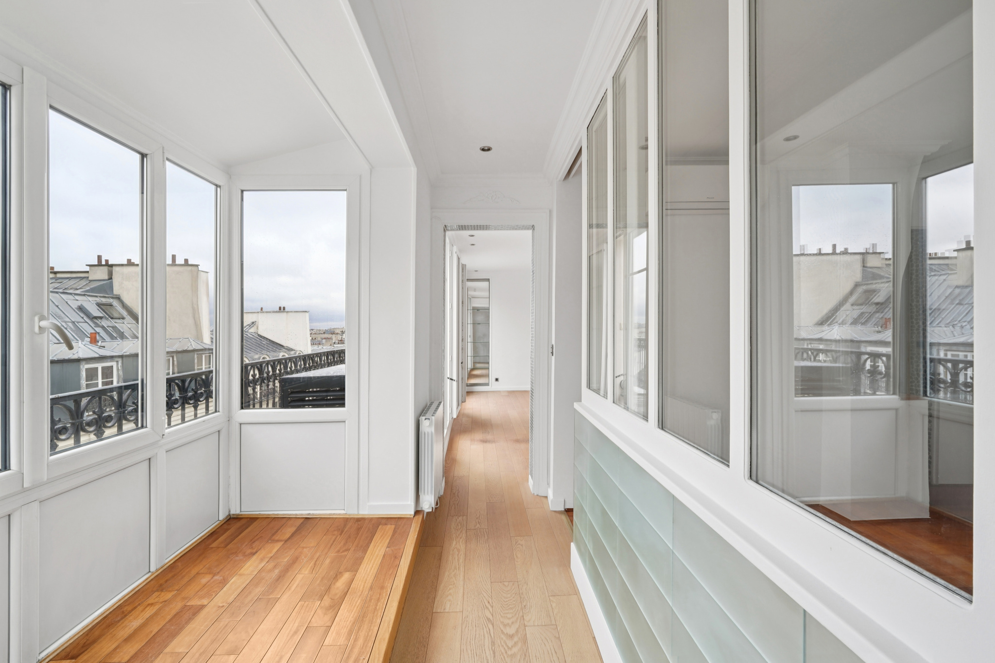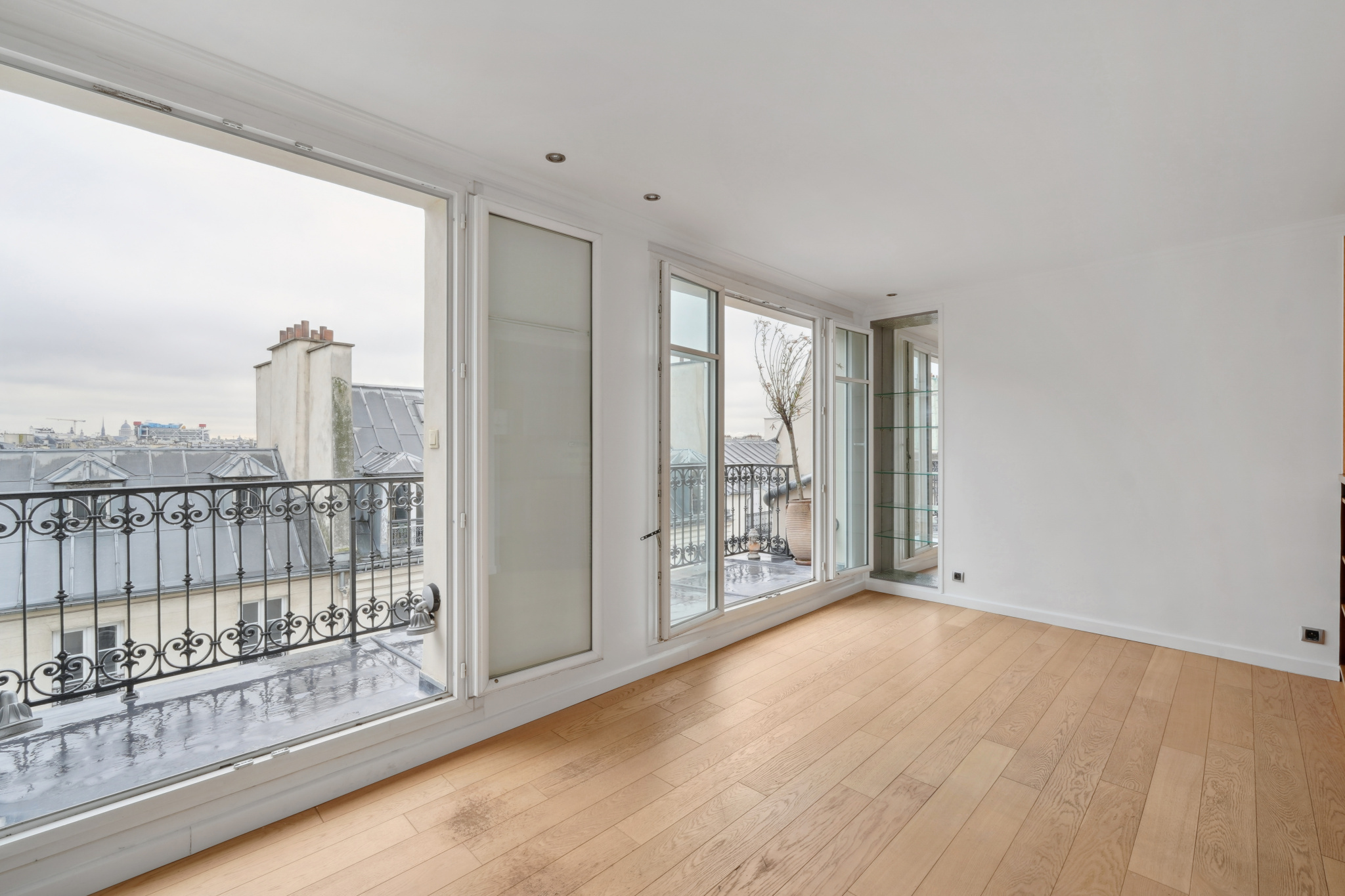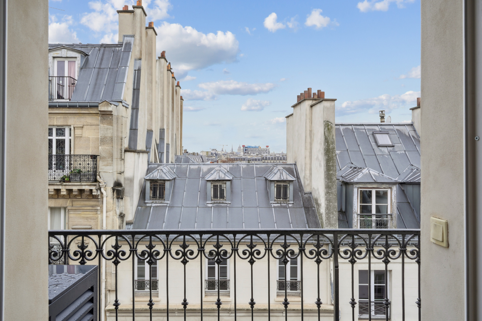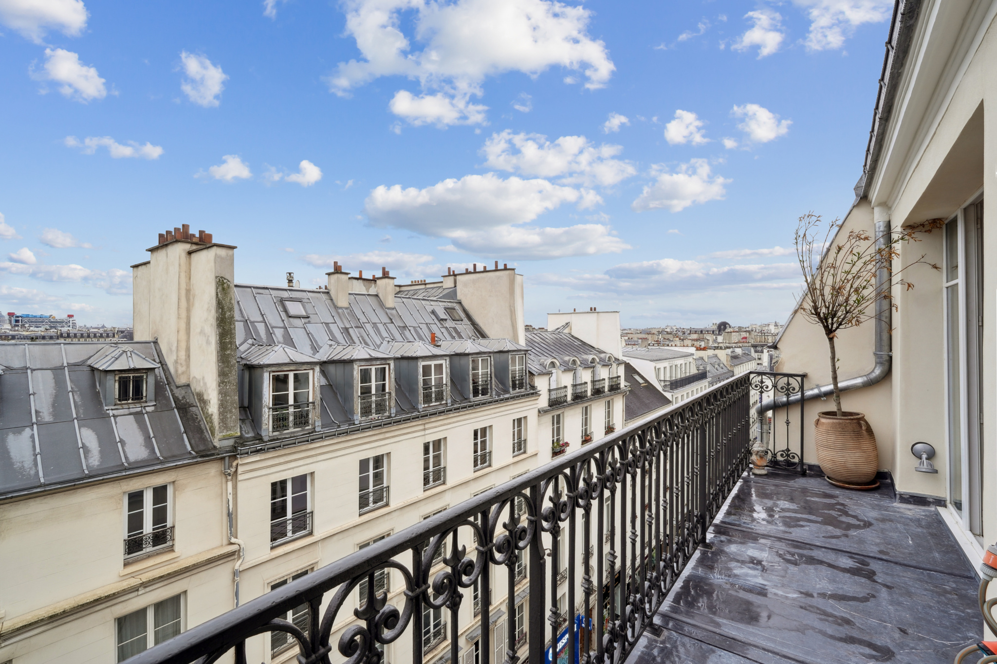 Le balcon /terrasse de 8 m² prolonge naturellement l’espace et offre une respiration unique sur les toits parisiens, avec en toile de fond plusieurs monuments.