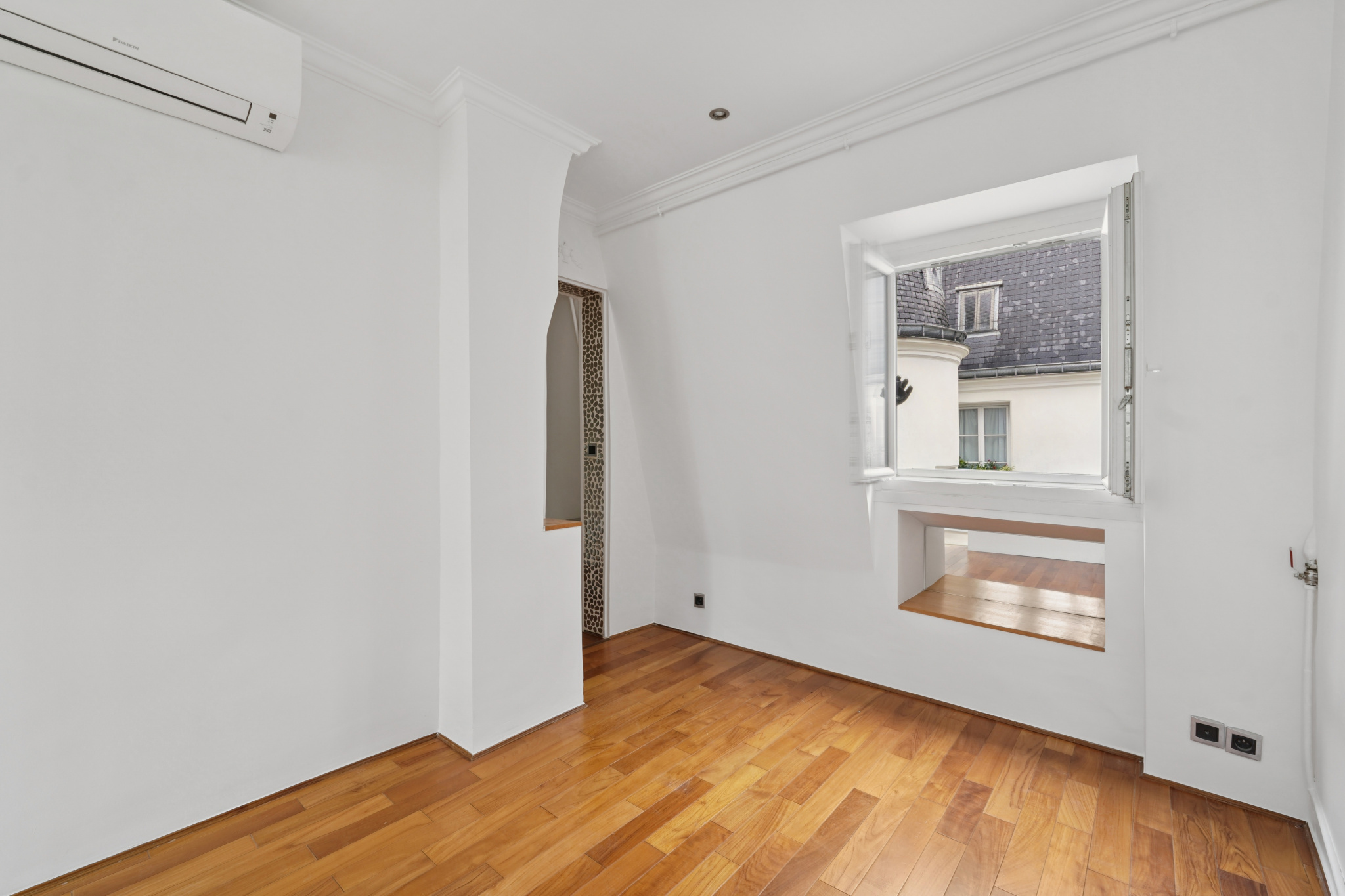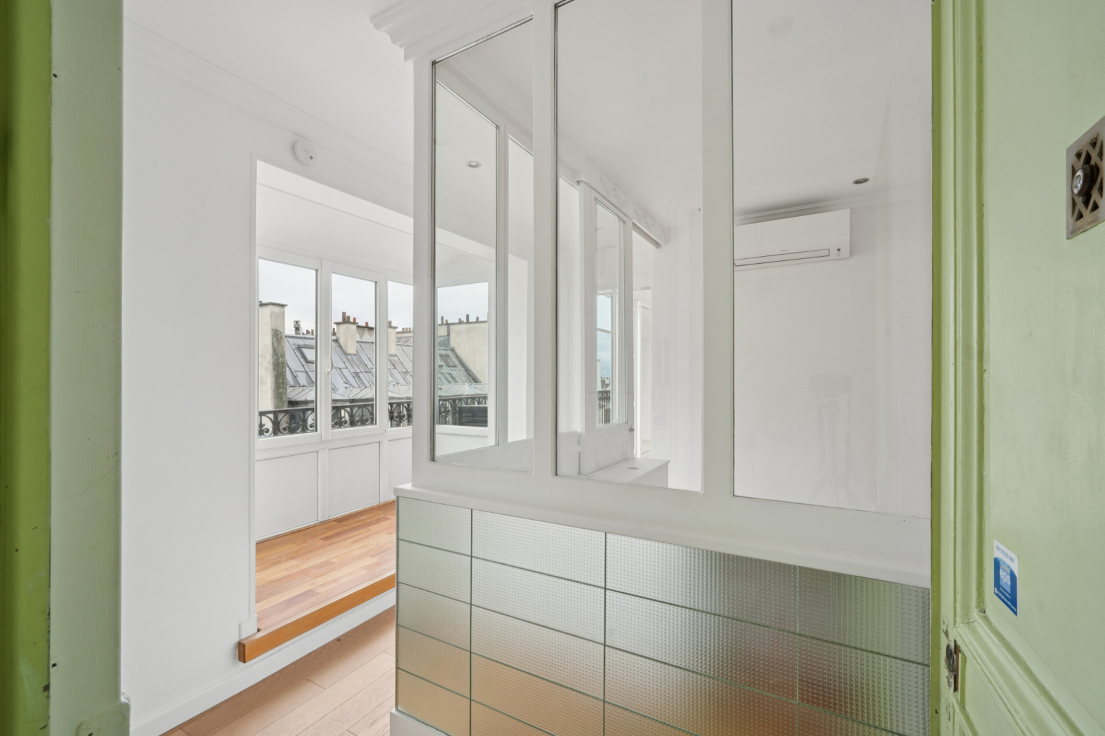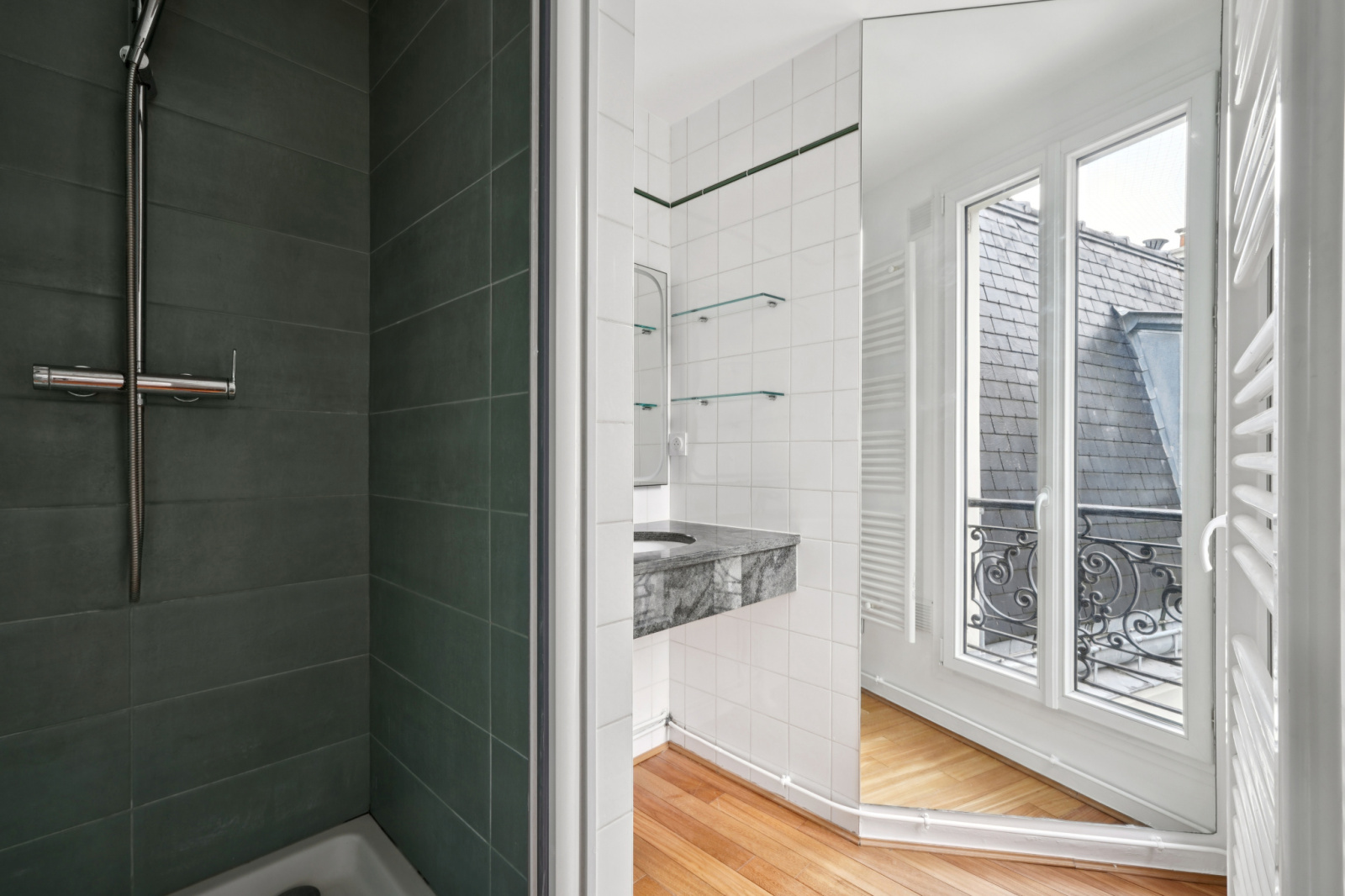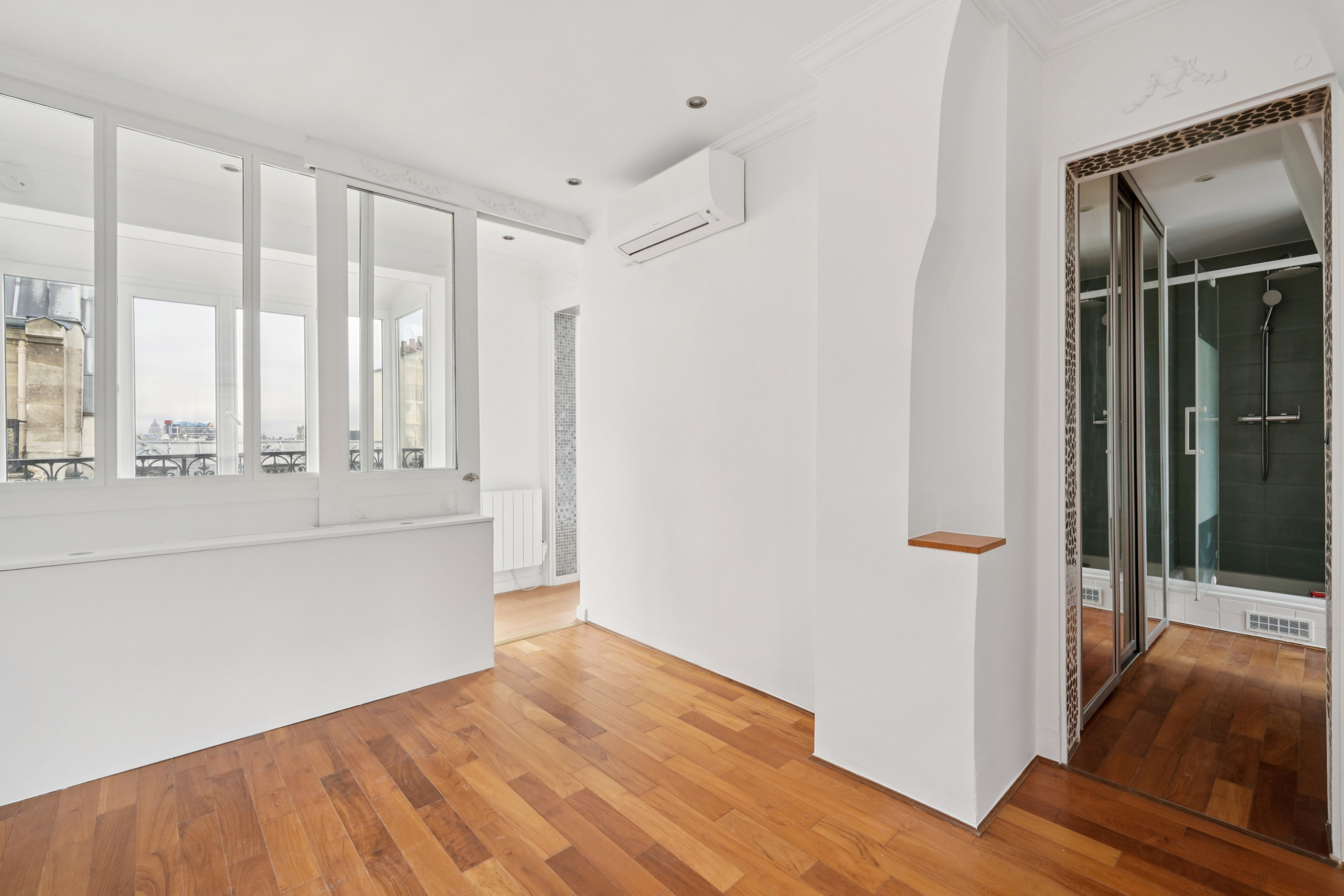 Le balcon /terrasse de 8 m² prolonge naturellement l’espace et offre une respiration unique sur les toits parisiens, avec en toile de fond plusieurs monuments.