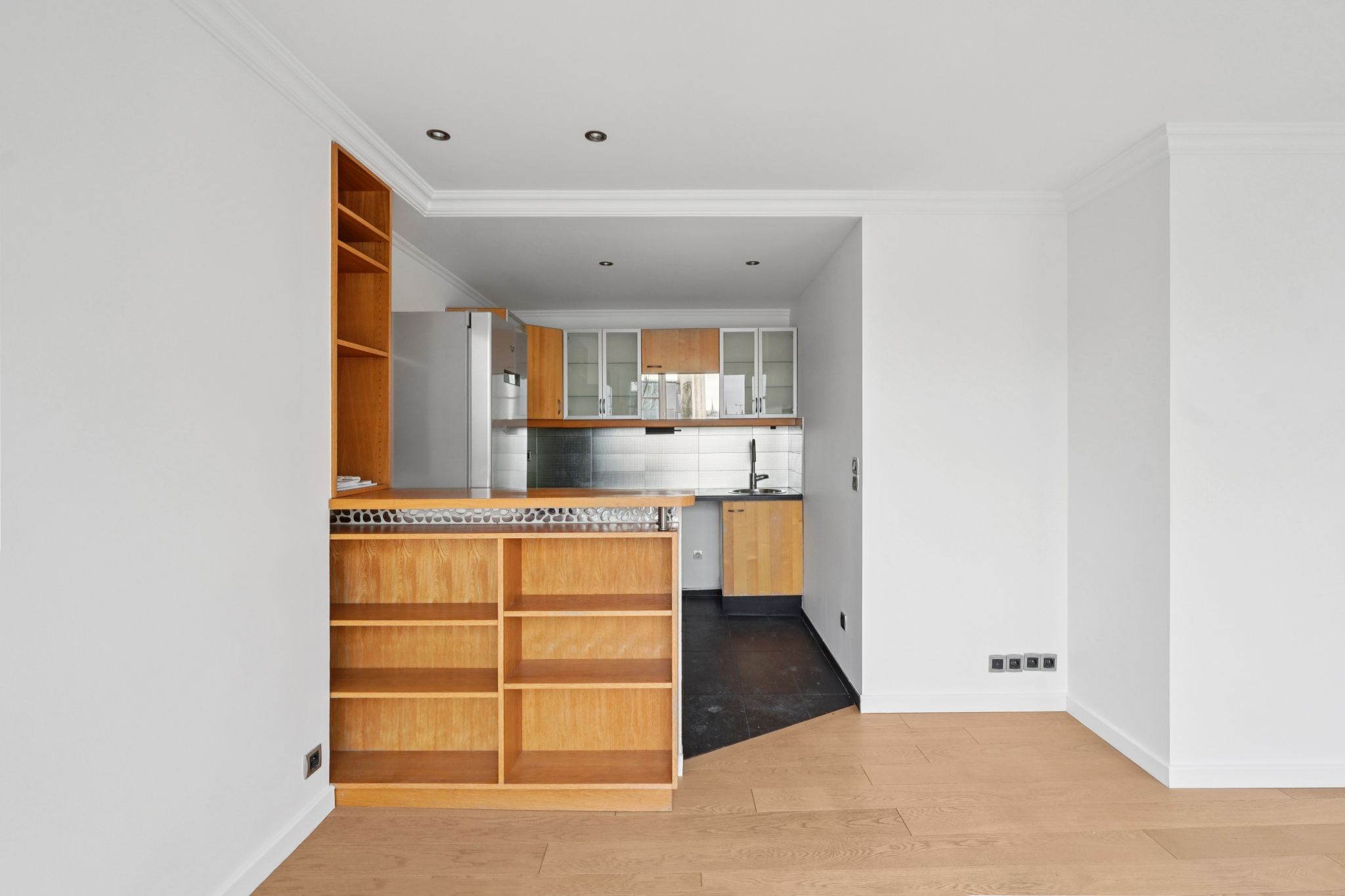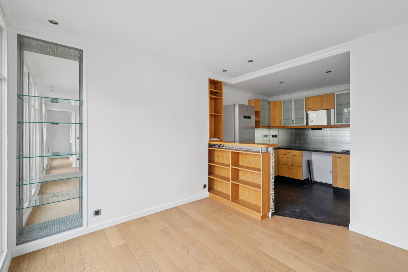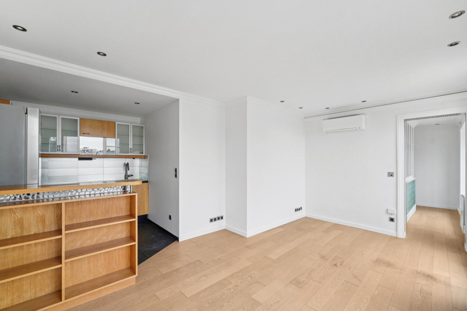 Il se compose d'une grande pièce de réception et sa cuisine américaine, entièrement ouverte sur l’extérieur grâce à de larges baies vitrées. À toute heure de la journée, la lumière traverse l’appartement. Le soleil plein sud et les vues dégagées ne quittent jamais les lieux.