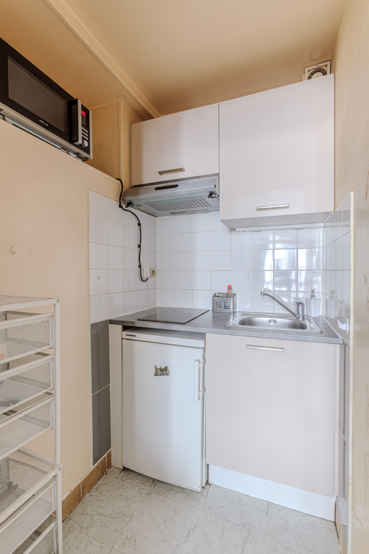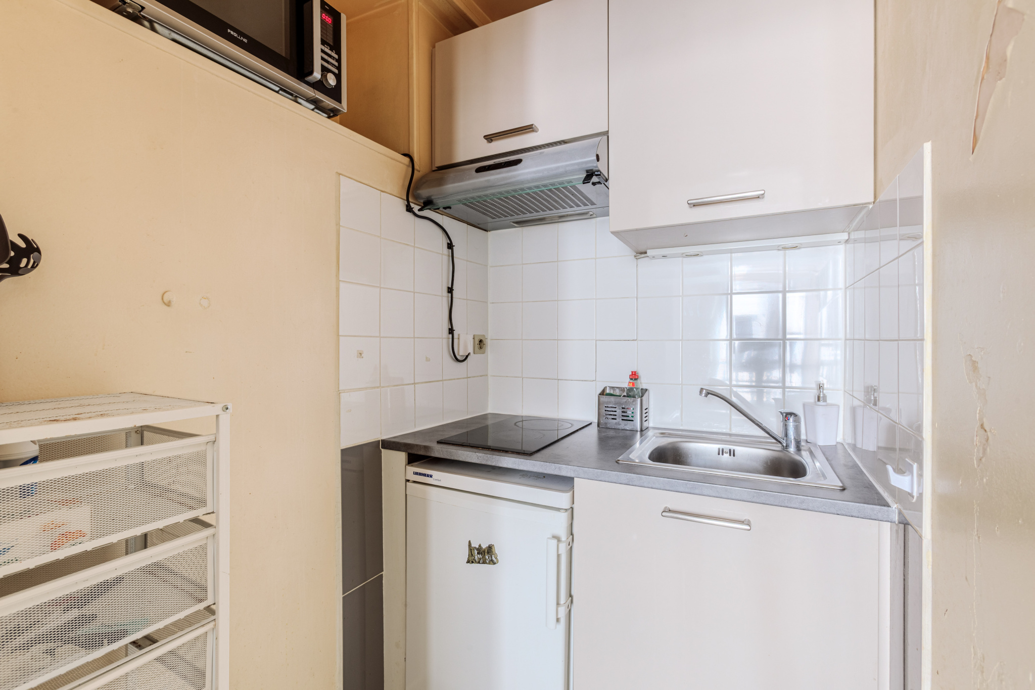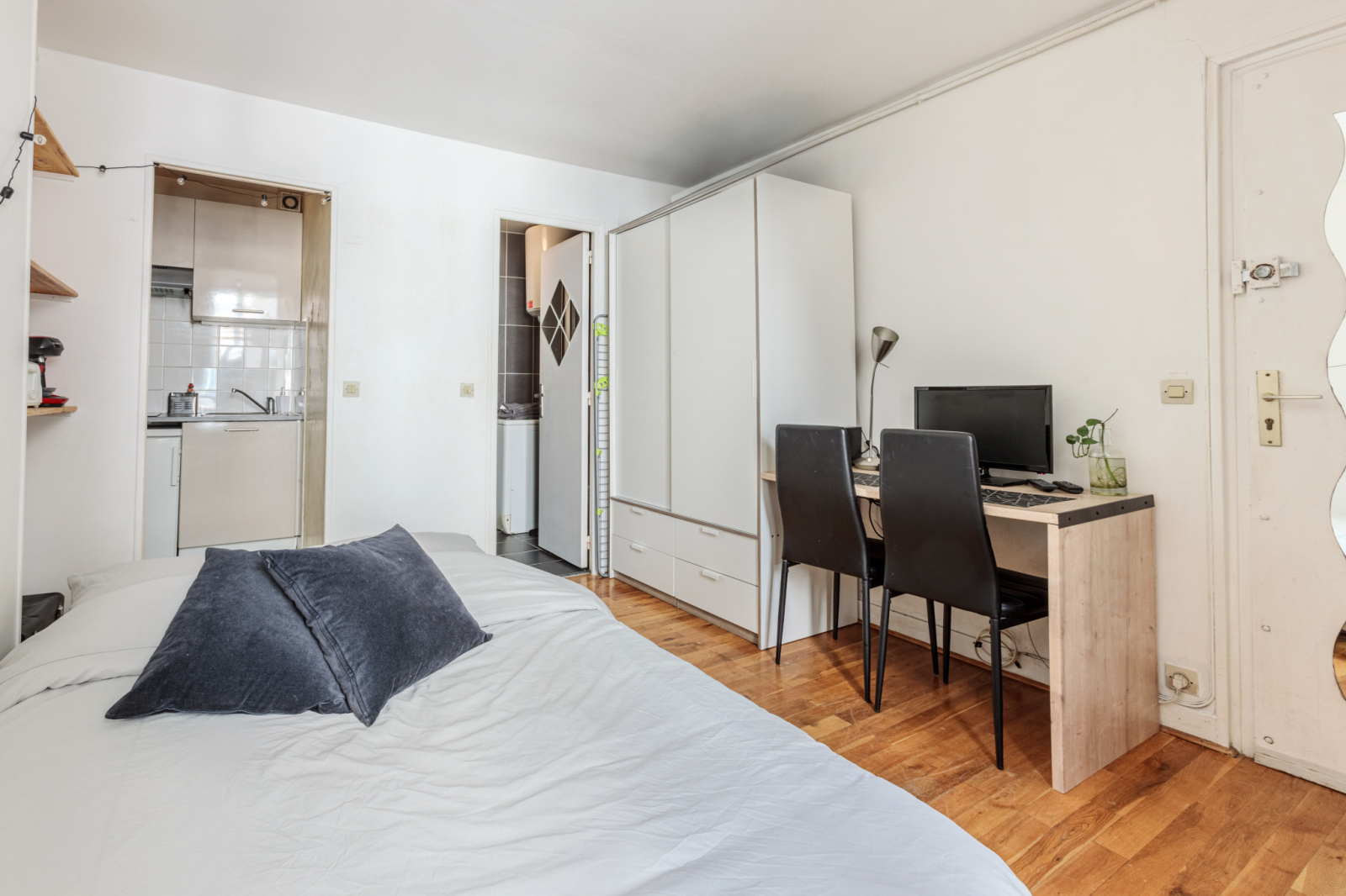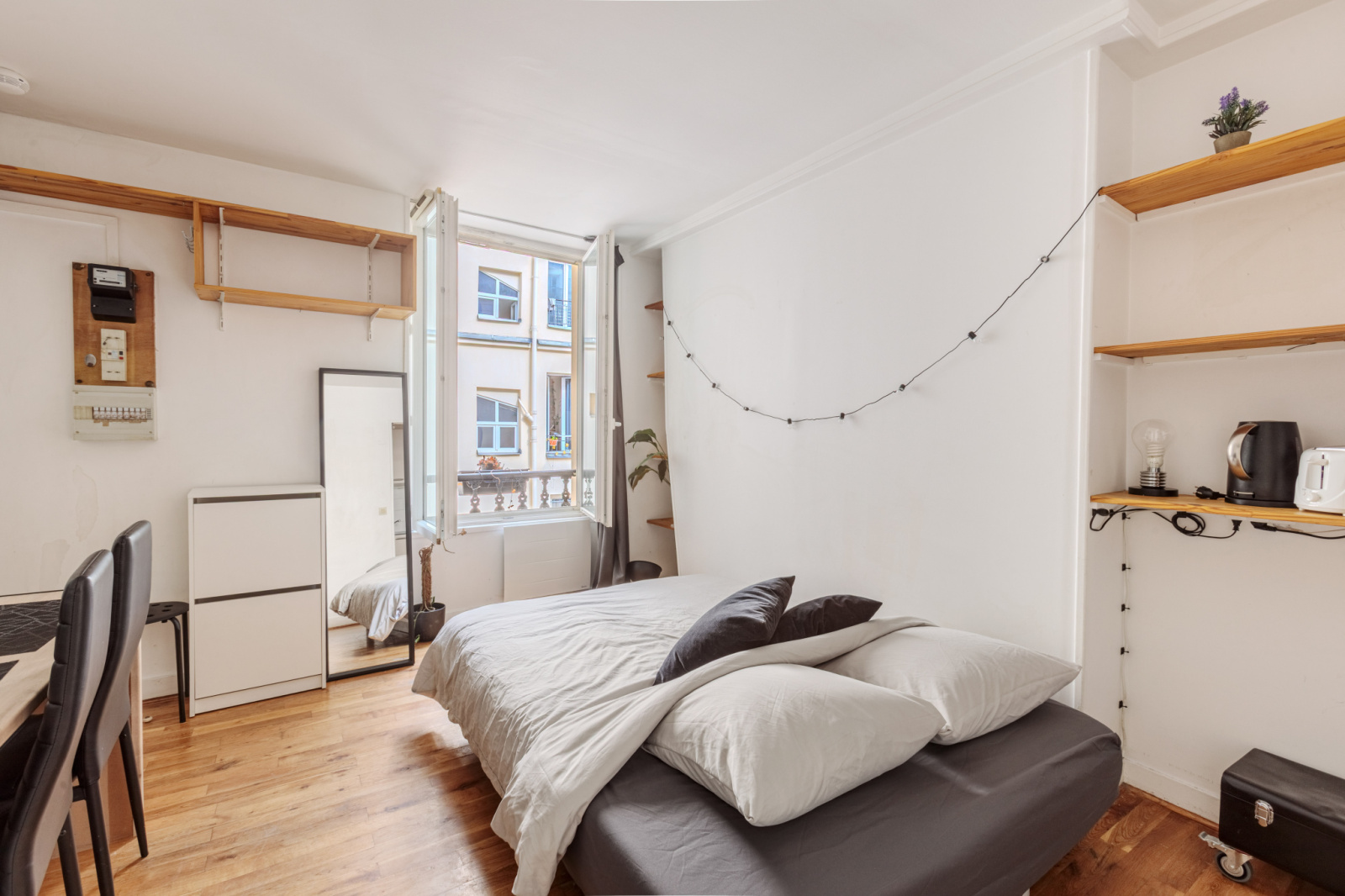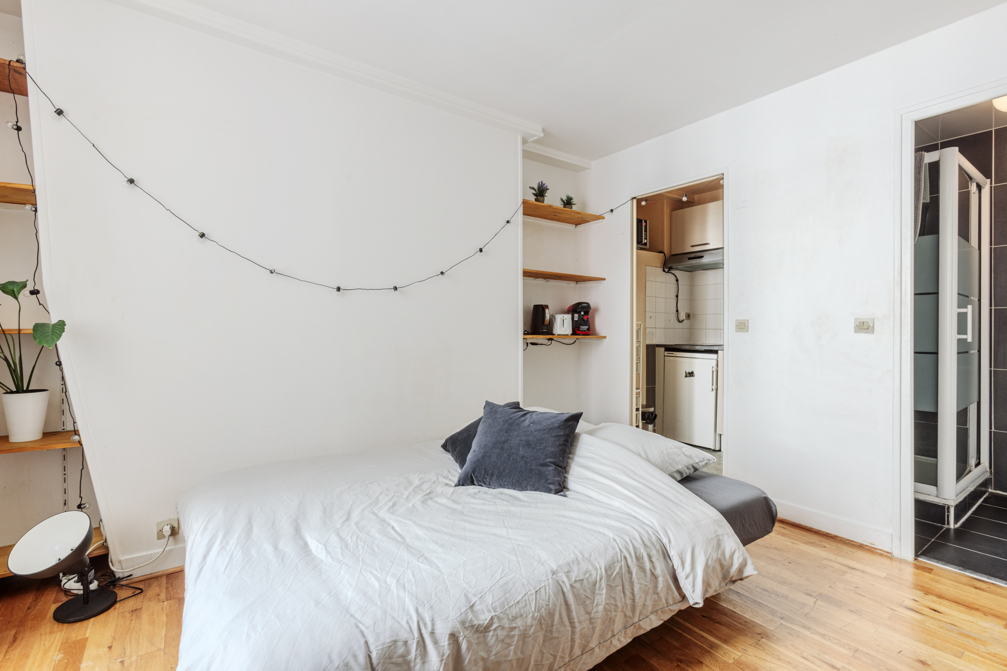 Donnant sur une cour intérieure, il se compose d’une pièce de vie lumineuse avec une belle fenêtre, d’une kitchenette fonctionnelle, et d’une salle d’eau avec douche et WC.