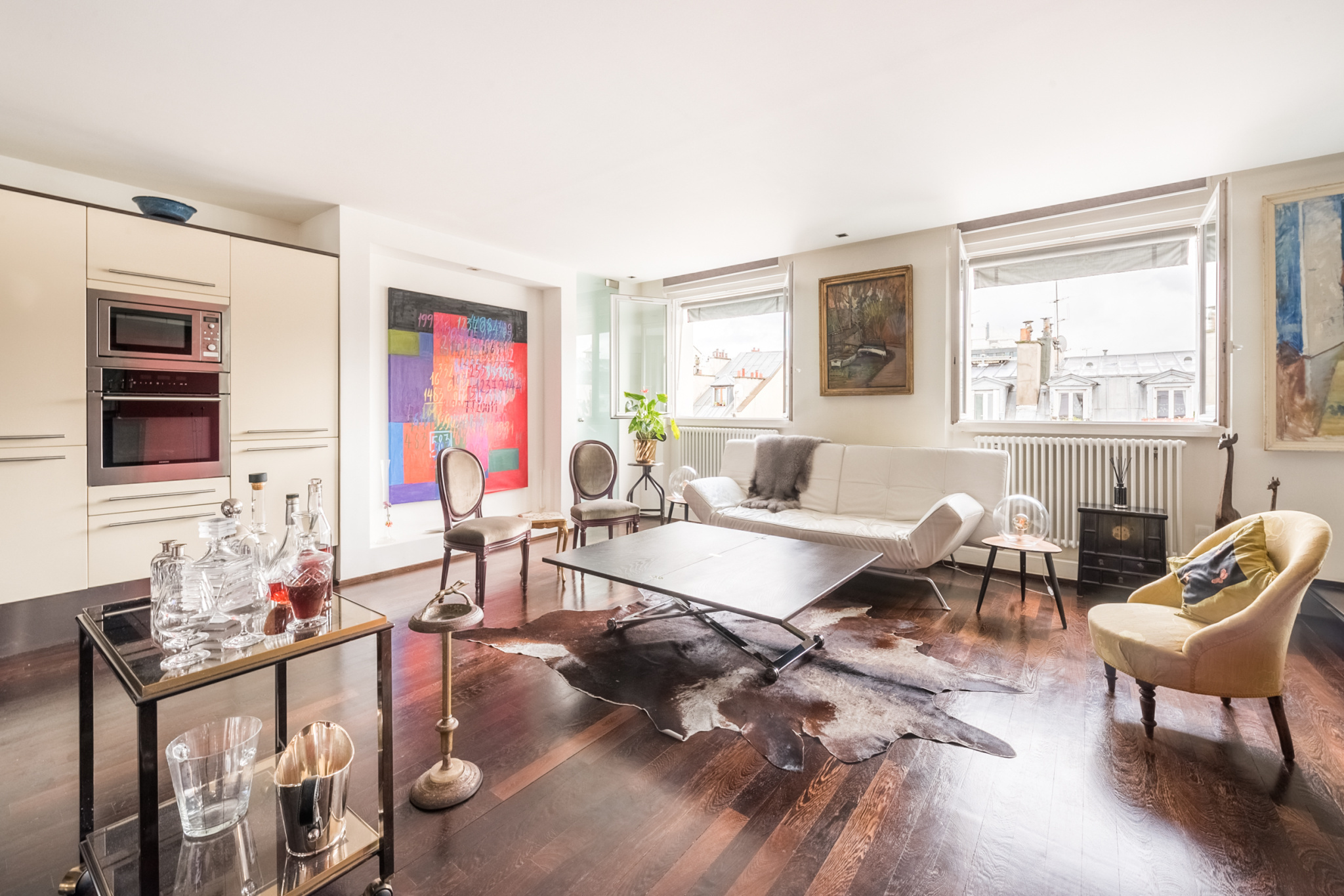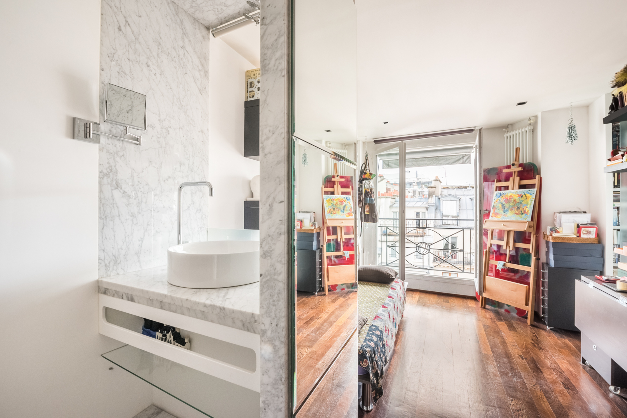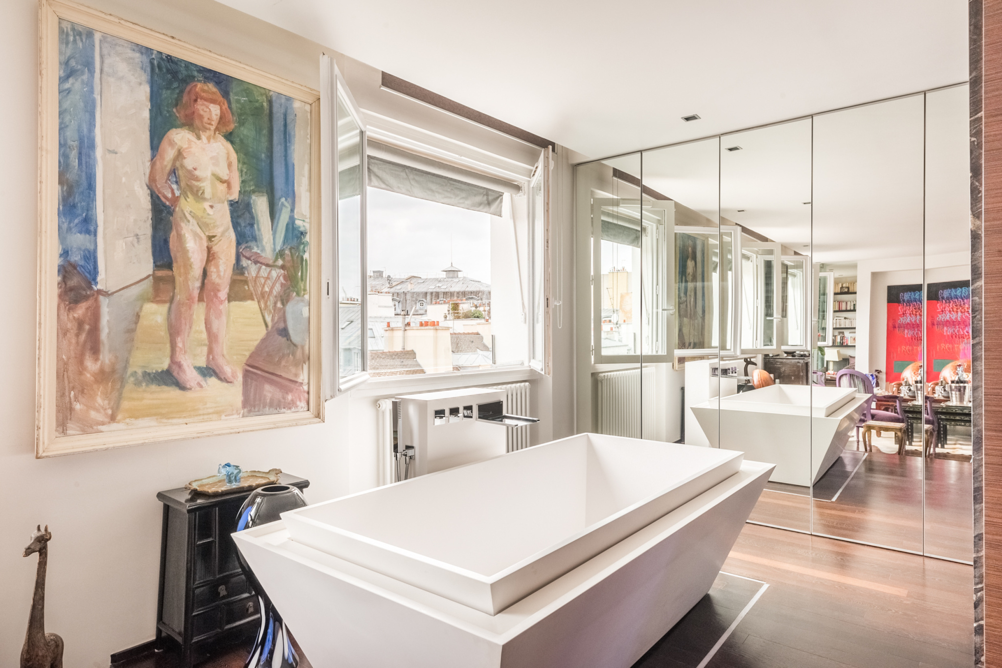 Il offre des atouts coup de coeur : il est en étage élevé, traversant Est/Ouest, vue sur les toits de Paris, rénovation et prestations de grandes qualités (marbre, parquet massif wengé, baignoire et douche en corian...).