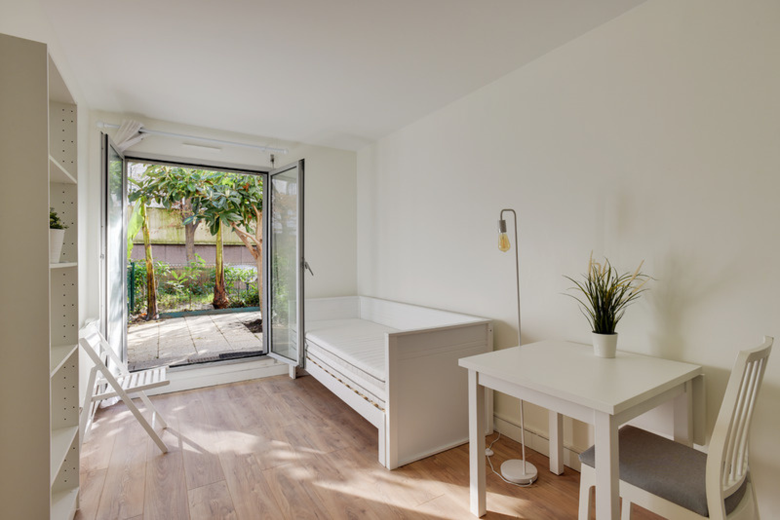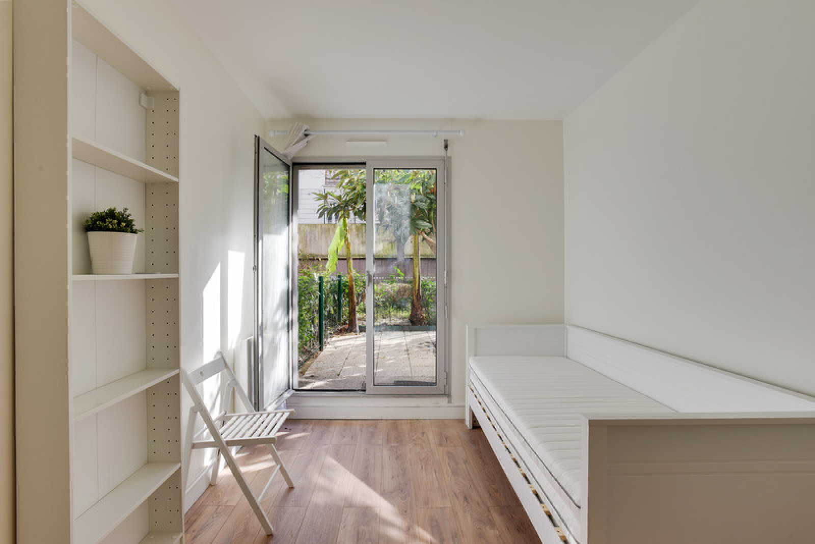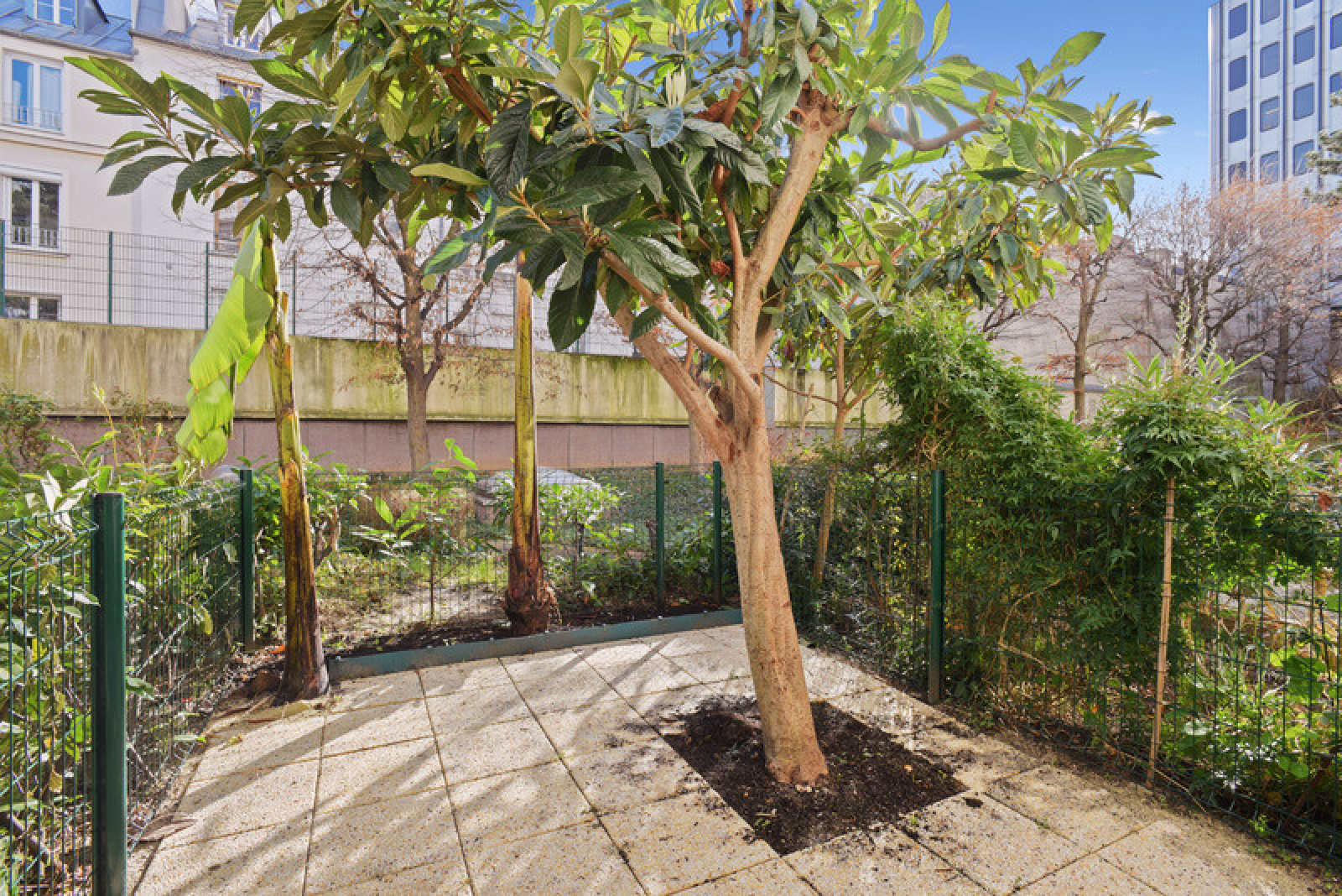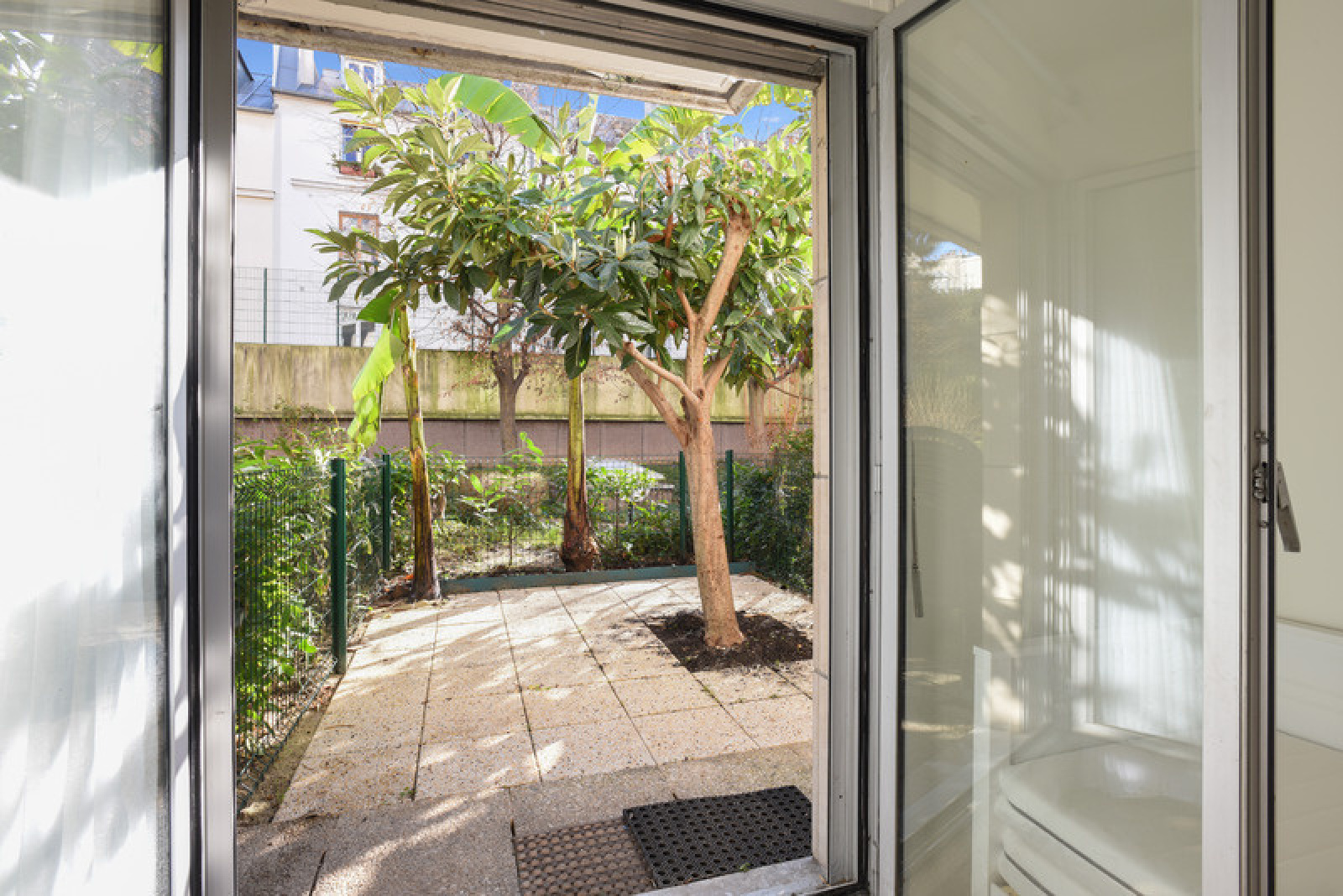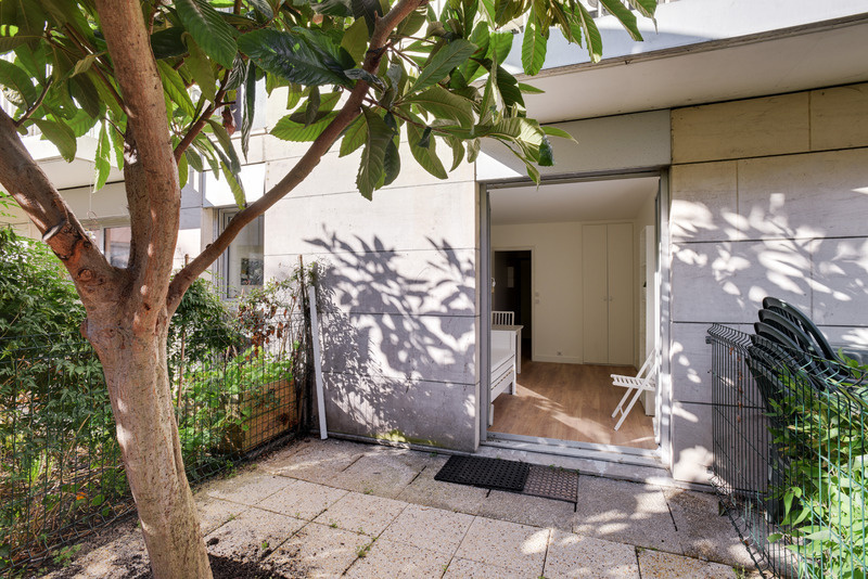 L'appartement dispose d'une porte fenêtre en double vitrage donnant accès au jardin de 12,63m2 avec un arbre tronant au milieu.