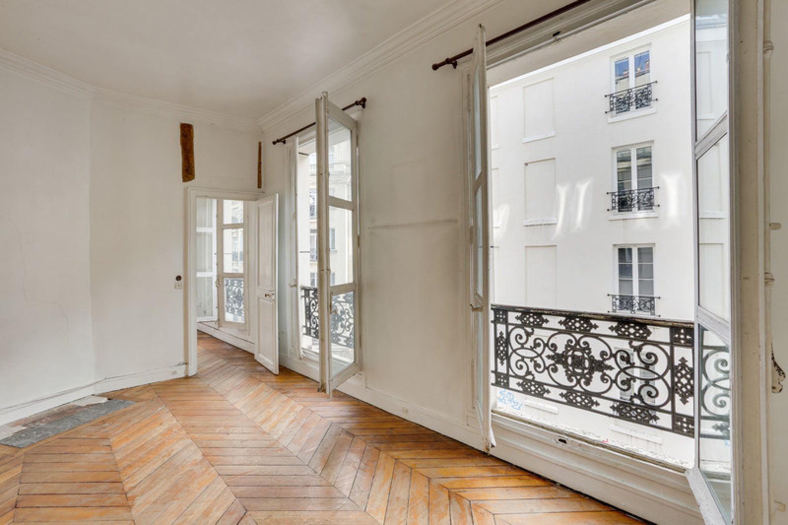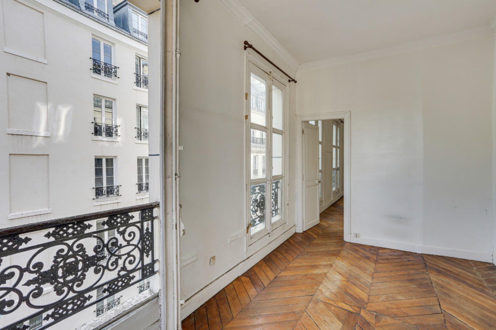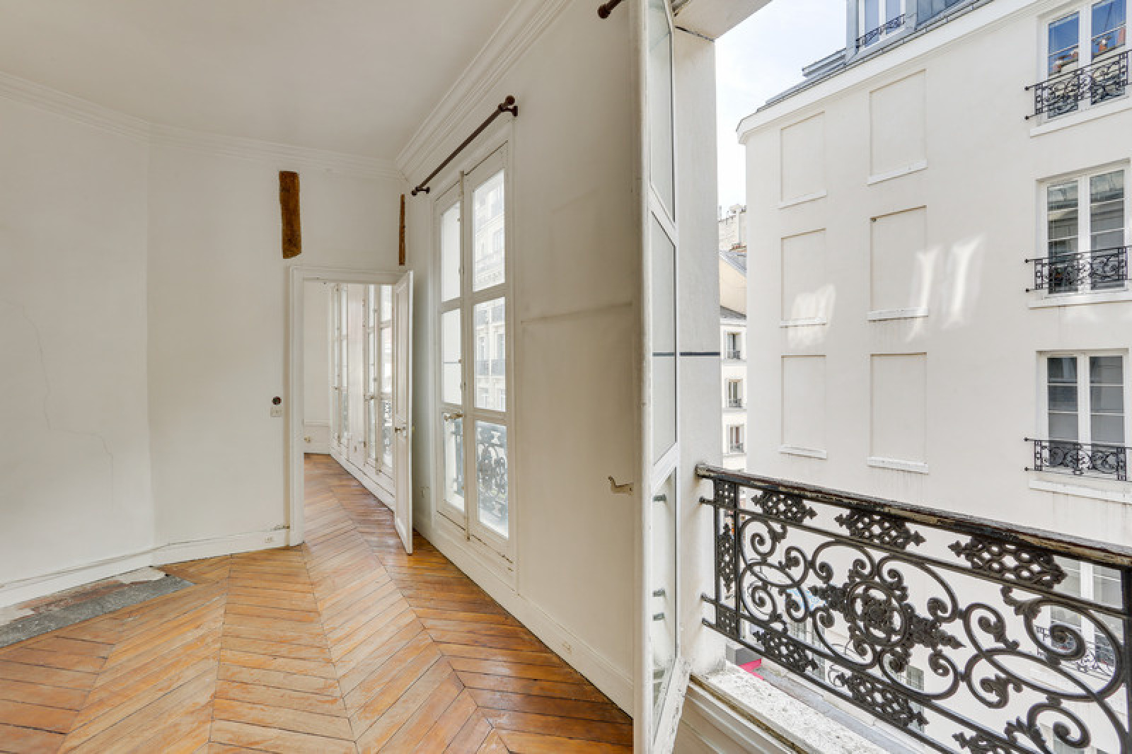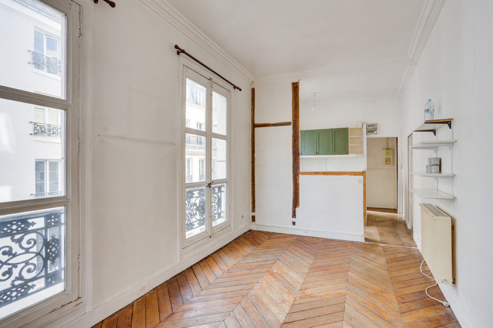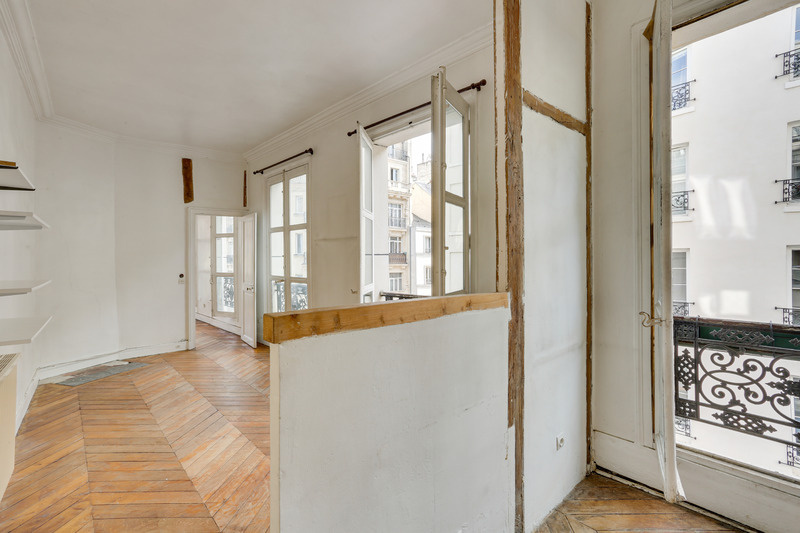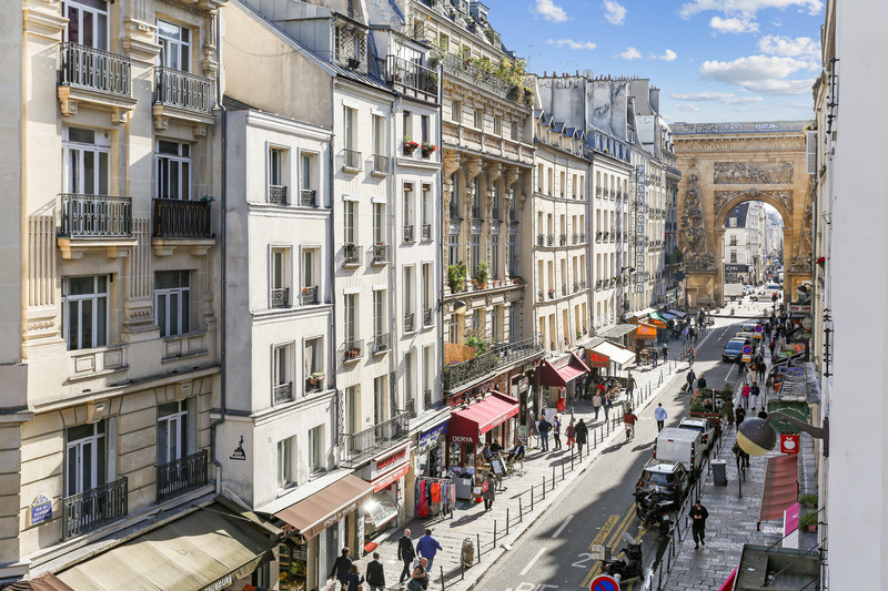 Il se compose d'une entrée avec une porte blindée, une pièce de vie de 22m² et sa cuisine ouverte ainsi que trois grandes fenêtres, une chambre de 13m² avec trois fenêtres également et une vue sur la Porte Saint-Denis et enfin une salle de bain avec wc.