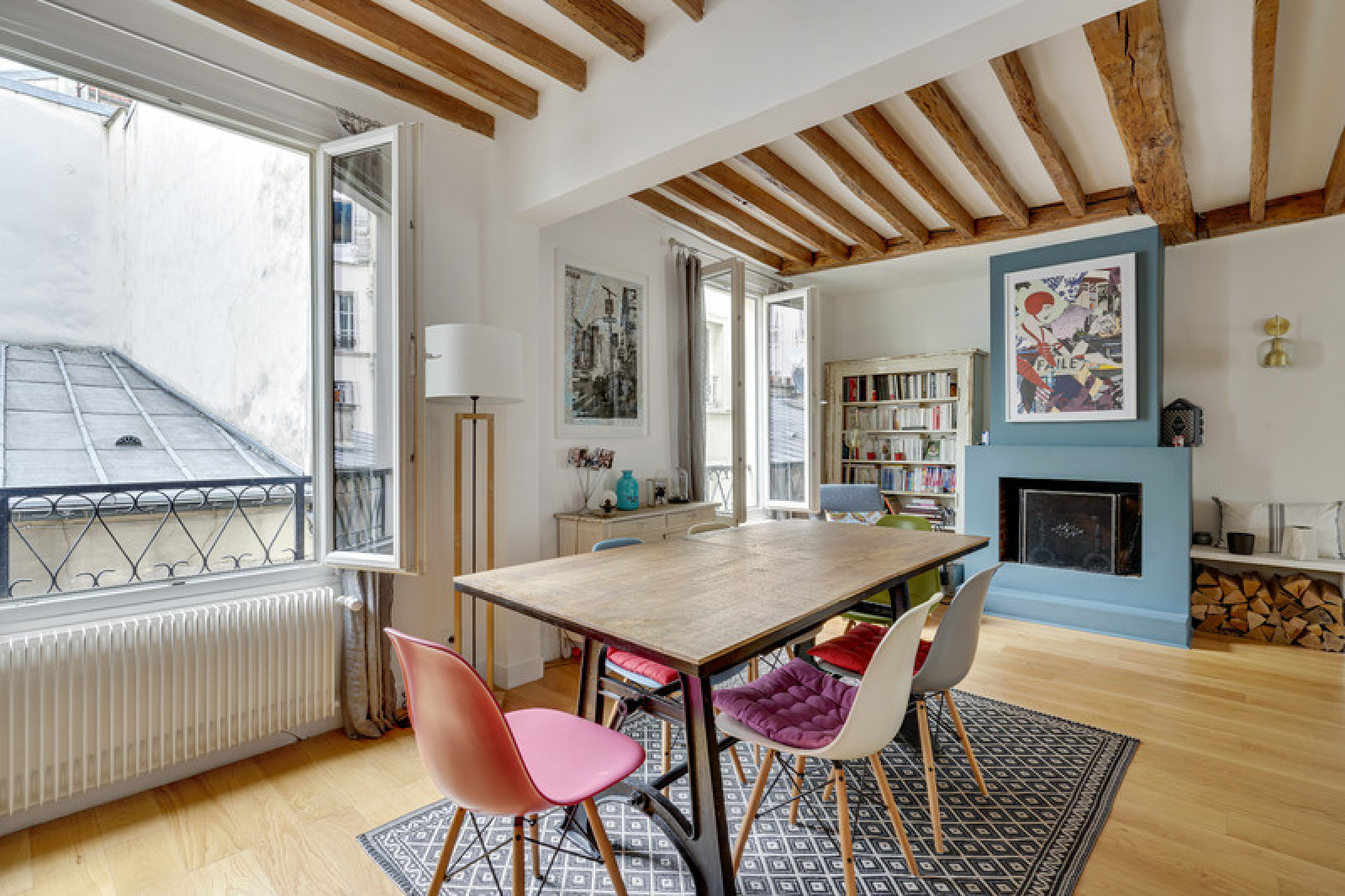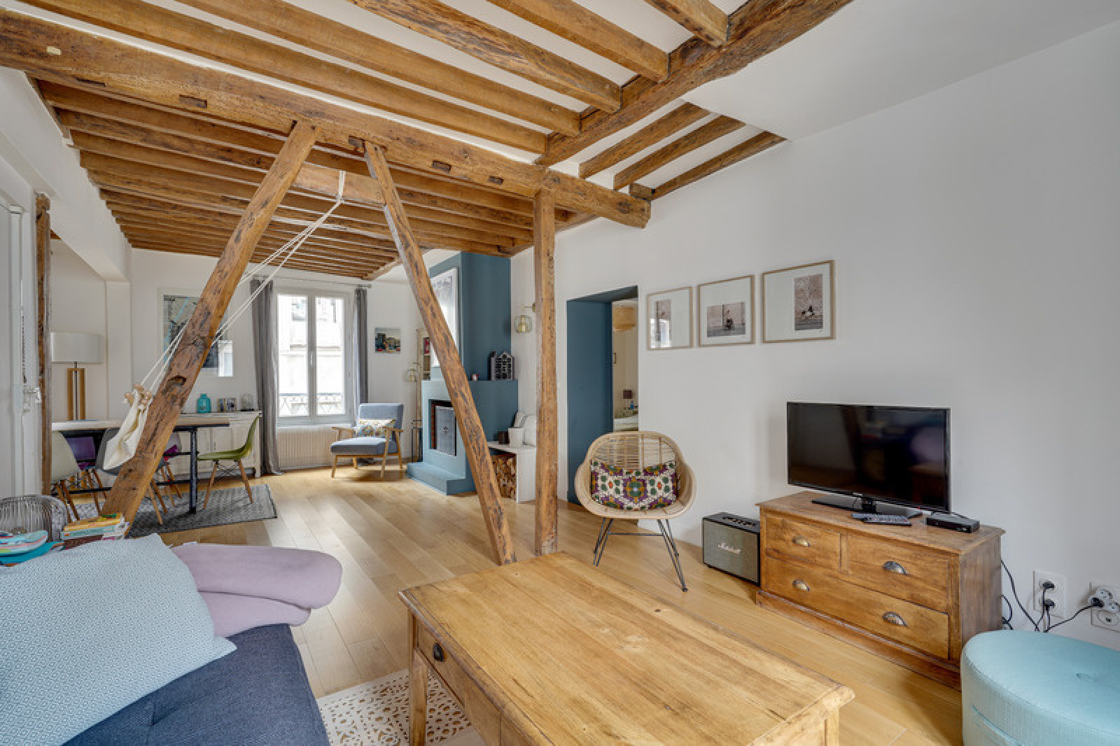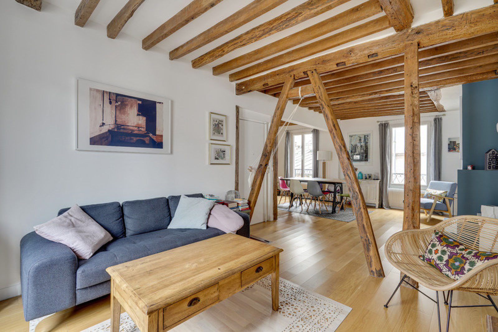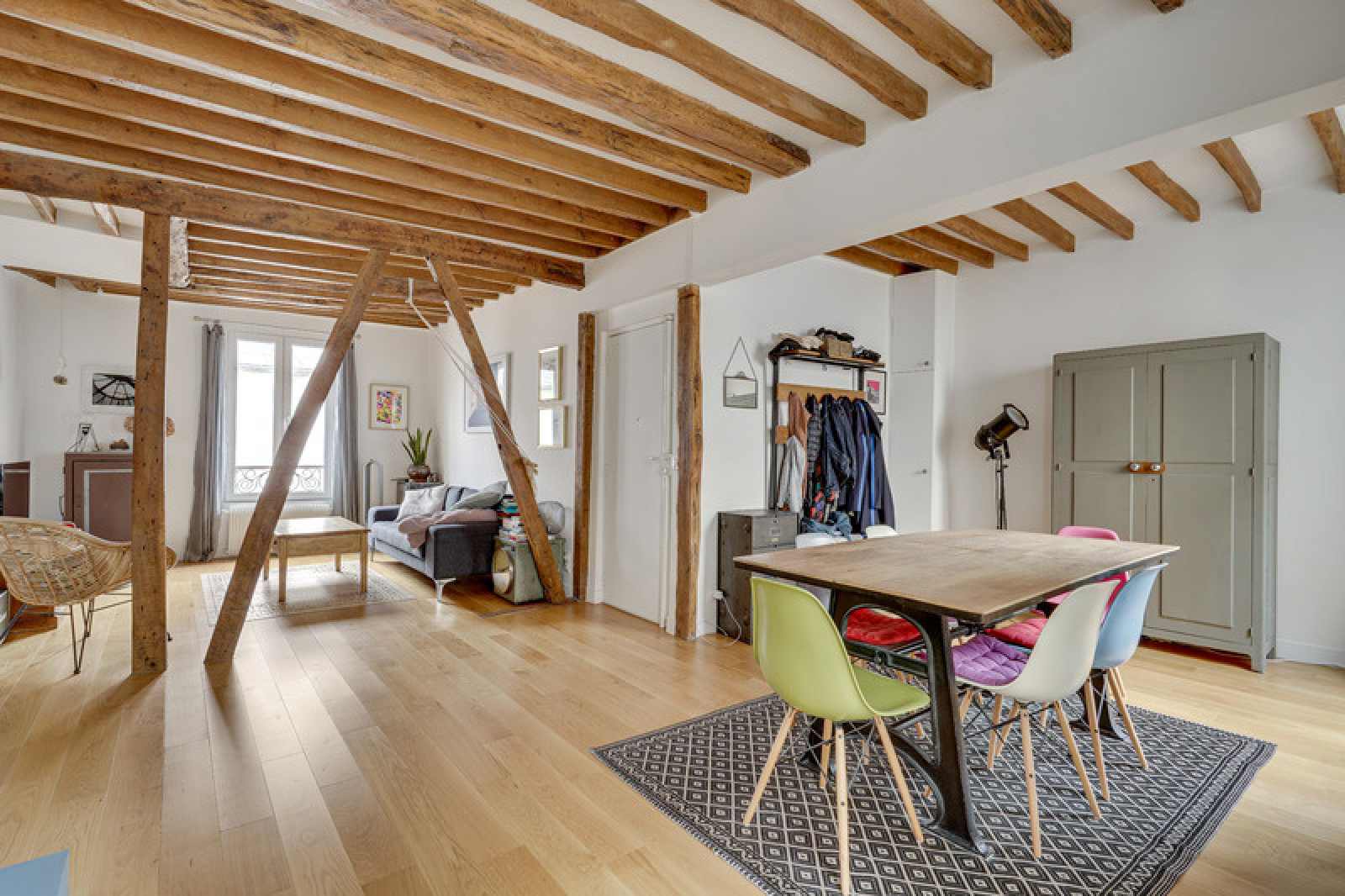 Cet appartement est un savant mélange du cachet de l'ancien et de goût moderne de par l'association des matériaux et des couleurs. En effet, ce bien dispose d'un parquet très bien entretenu, une cheminée qui fonctionne, de très beaux colombages et des poutres au plafond qui viennent parfaire le charme de cet appartement.