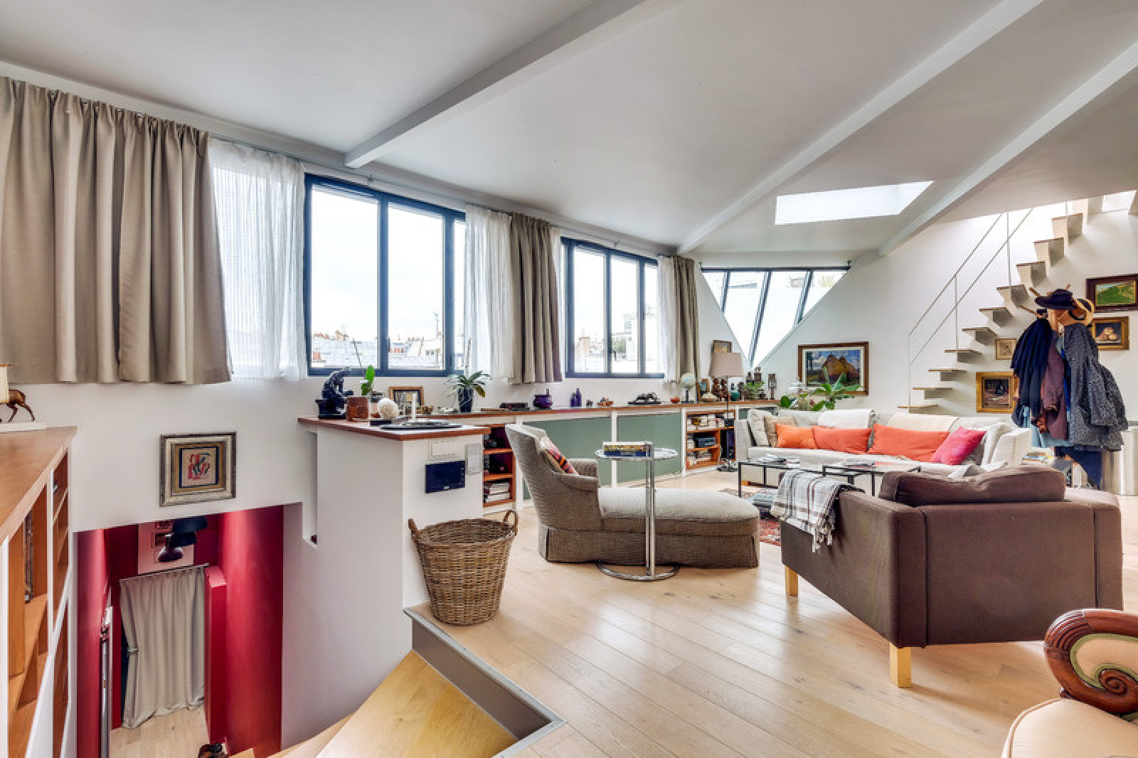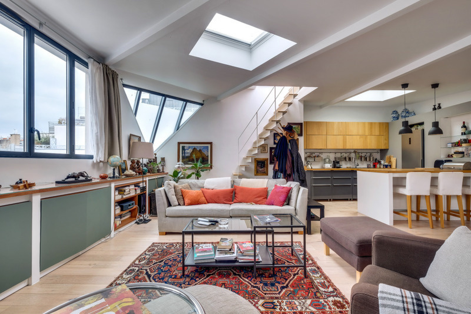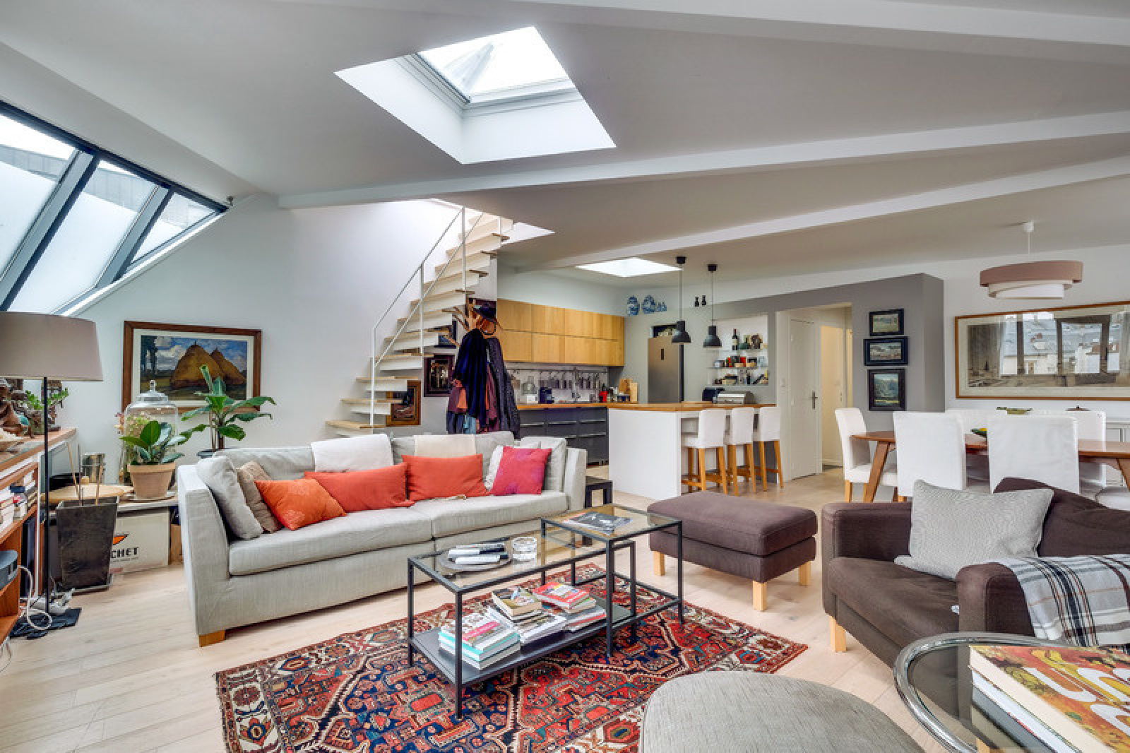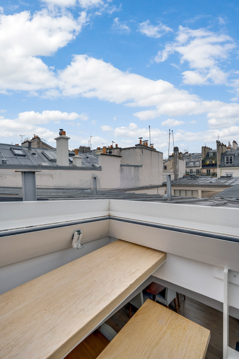 L'accès au bien nécessite de monter un grand escalier intérieur. Il propose une belle réception de 50m² comprenant la cuisine intégrée et équipée , une première chambre et son dressing , une seconde chambre avec cloison amovible (bureau actuellement ) , une salle d'eau avec bains/douche/wc et un second wc séparé. La jouissance du toit est accordée au logement par la copropriété et accessible par un escalier intérieur ( Pas de terrasse officielle déclarée à l'urbanisme ) . L'appartement est traversant et propose trois velux de toit, ses vues sont en grande partie dégagées . Il est en état parfait avec une décoration qualitative et un aménagement sur mesure pensé par un architecte. les normes d'isolation sont parfaites. Il est calme sans aucune nuisance de bruit extérieur ni voisin.Vente longue pour septembre 2022.