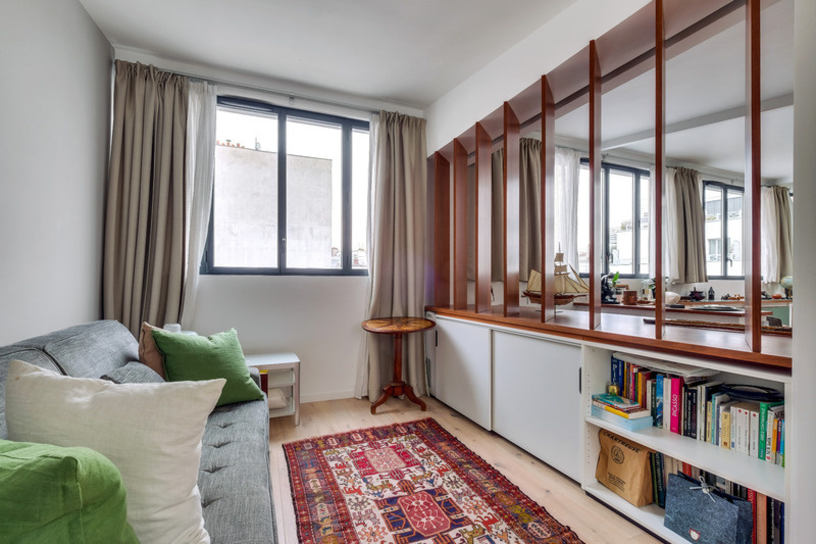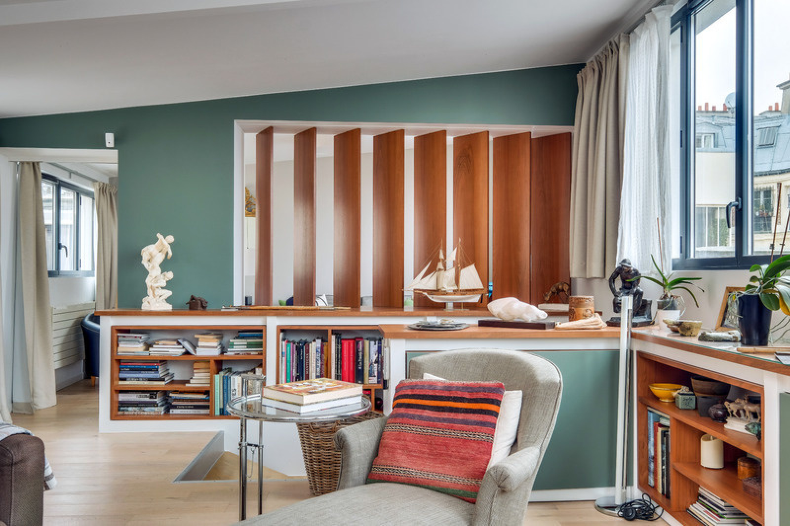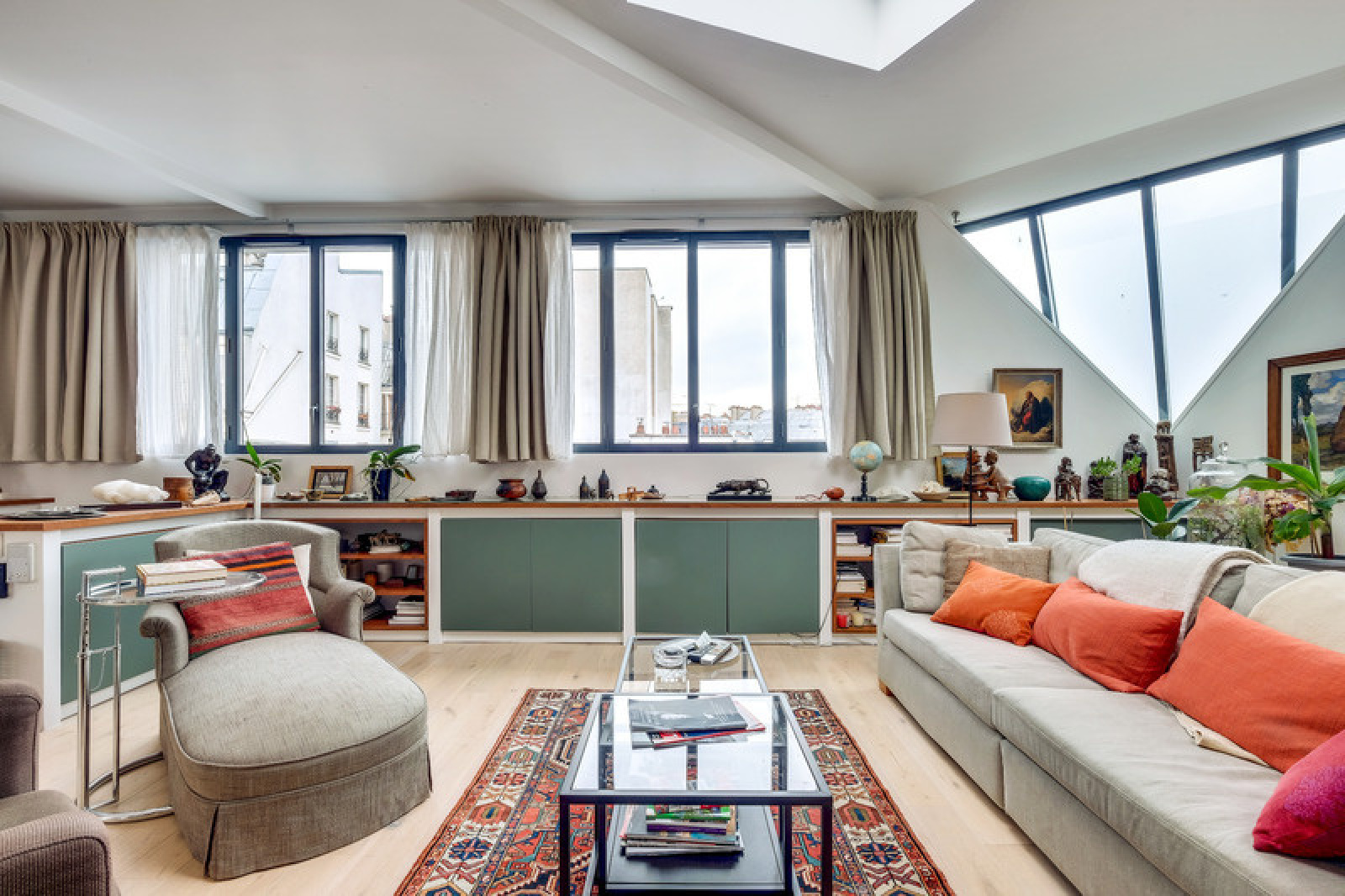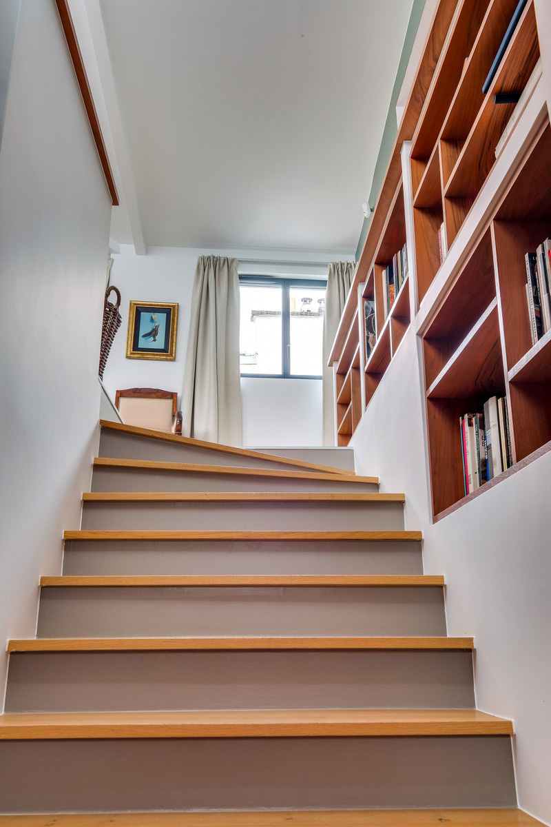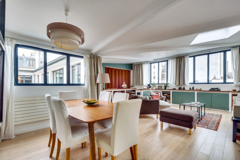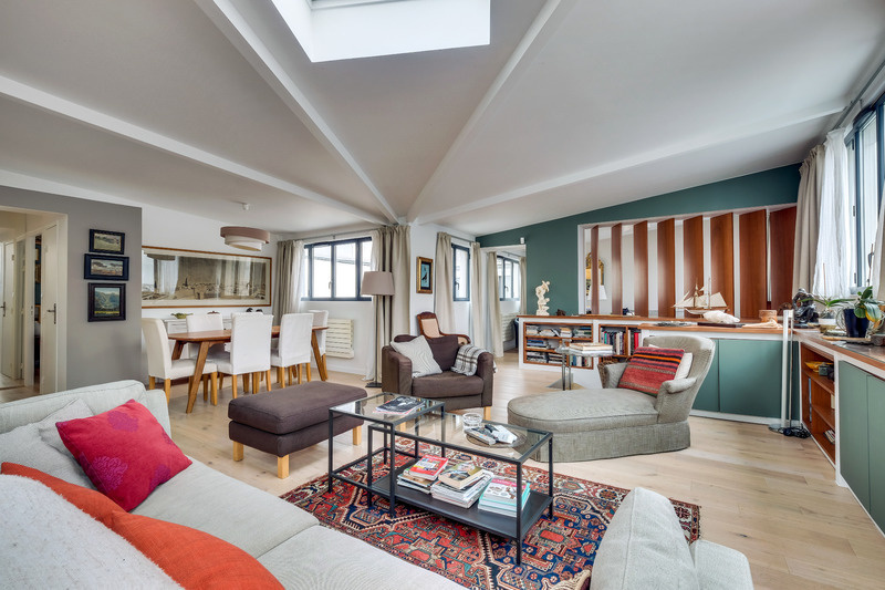 L'accès au bien nécessite de monter un grand escalier intérieur. Il propose une belle réception de 50m² comprenant la cuisine intégrée et équipée , une première chambre et son dressing , une seconde chambre avec cloison amovible (bureau actuellement ) , une salle d'eau avec bains/douche/wc et un second wc séparé. La jouissance du toit est accordée au logement par la copropriété et accessible par un escalier intérieur ( Pas de terrasse officielle déclarée à l'urbanisme ) . L'appartement est traversant et propose trois velux de toit, ses vues sont en grande partie dégagées . Il est en état parfait avec une décoration qualitative et un aménagement sur mesure pensé par un architecte. les normes d'isolation sont parfaites. Il est calme sans aucune nuisance de bruit extérieur ni voisin.Vente longue pour septembre 2022.