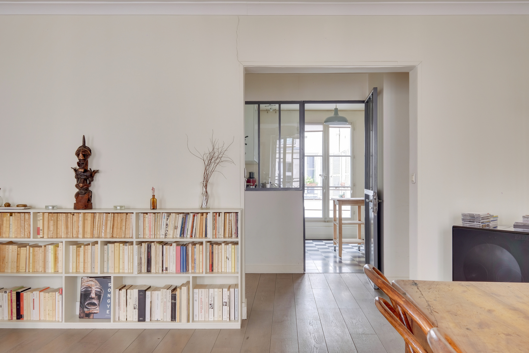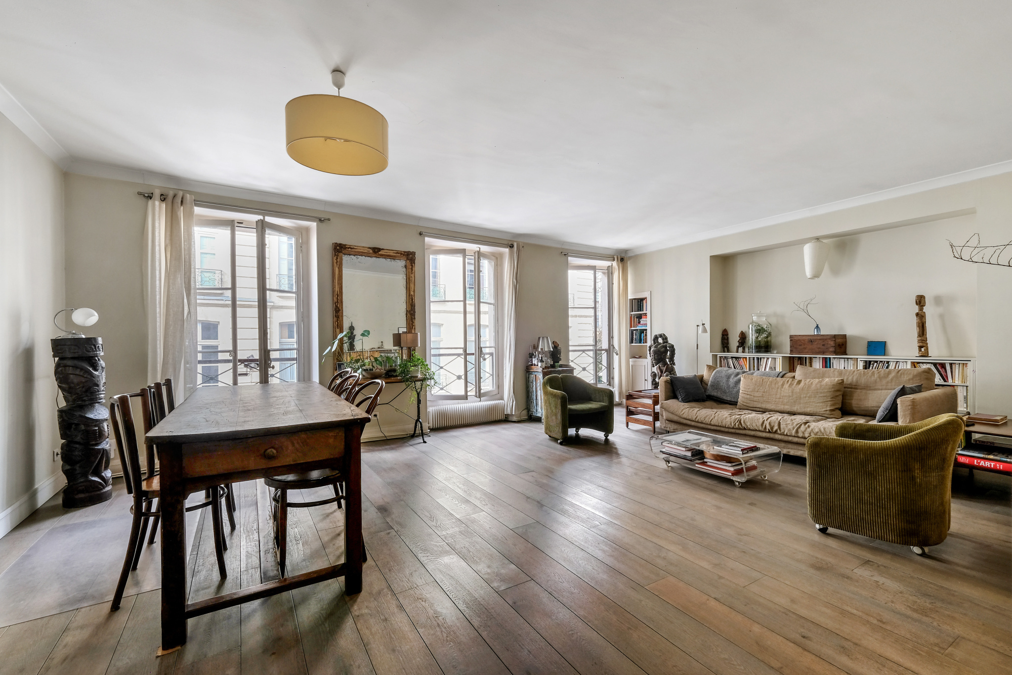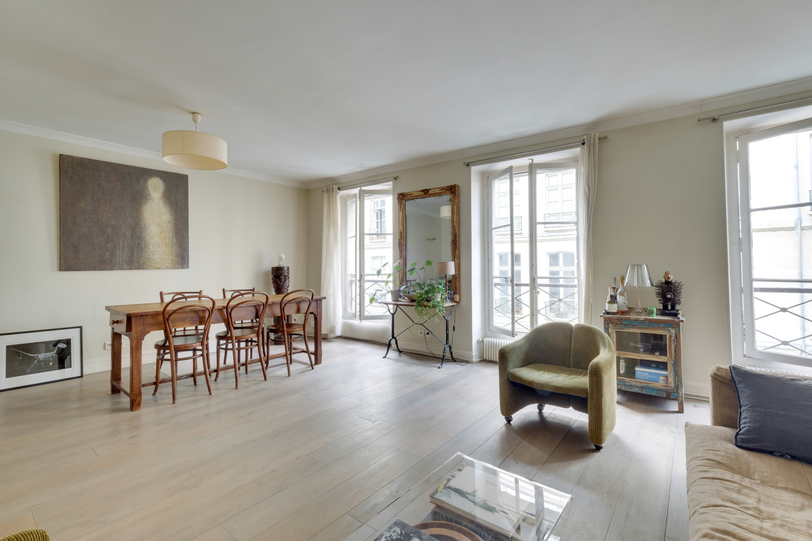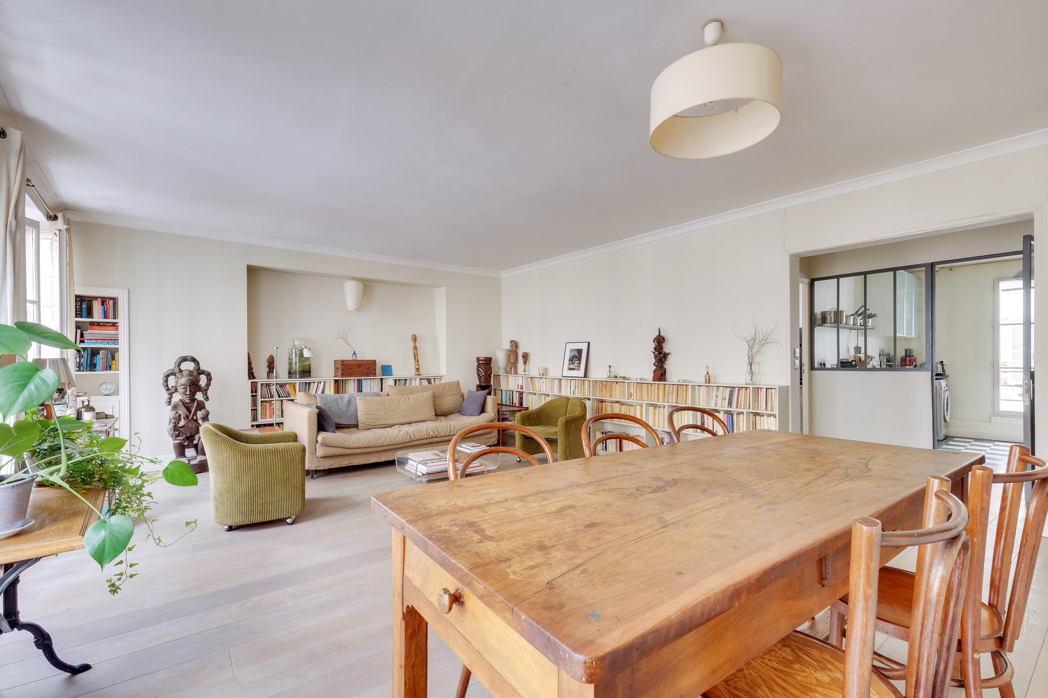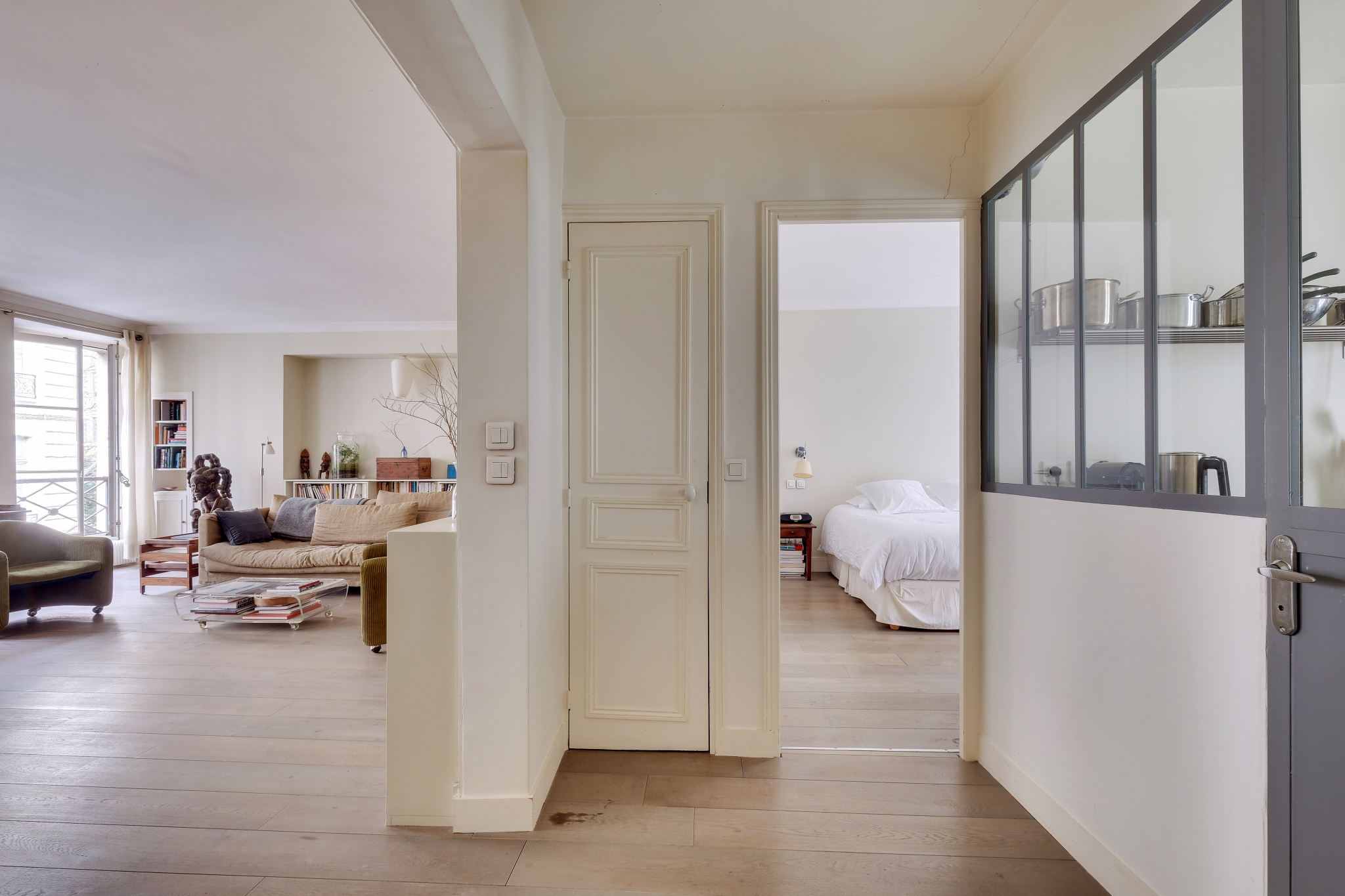 Il se compose d'une entrée en étoile , une cuisine dînatoire et sa verrière, une vaste double réception de 32m² , une chambre coté cour de 15m² , une chambre coté rue de 13m² , une salle de douche avec double vasque, un wc séparé.