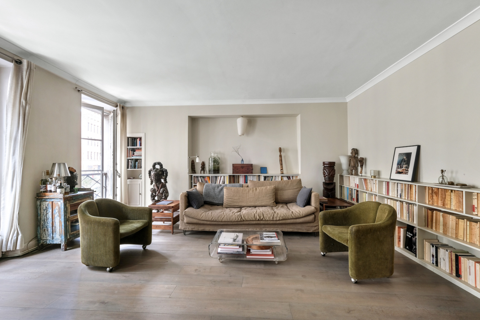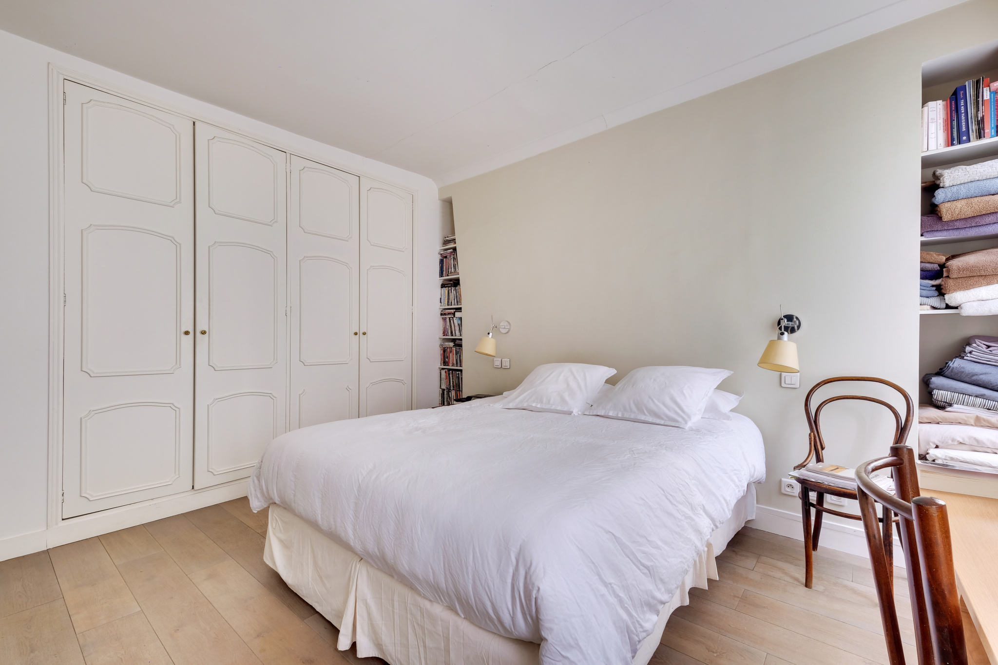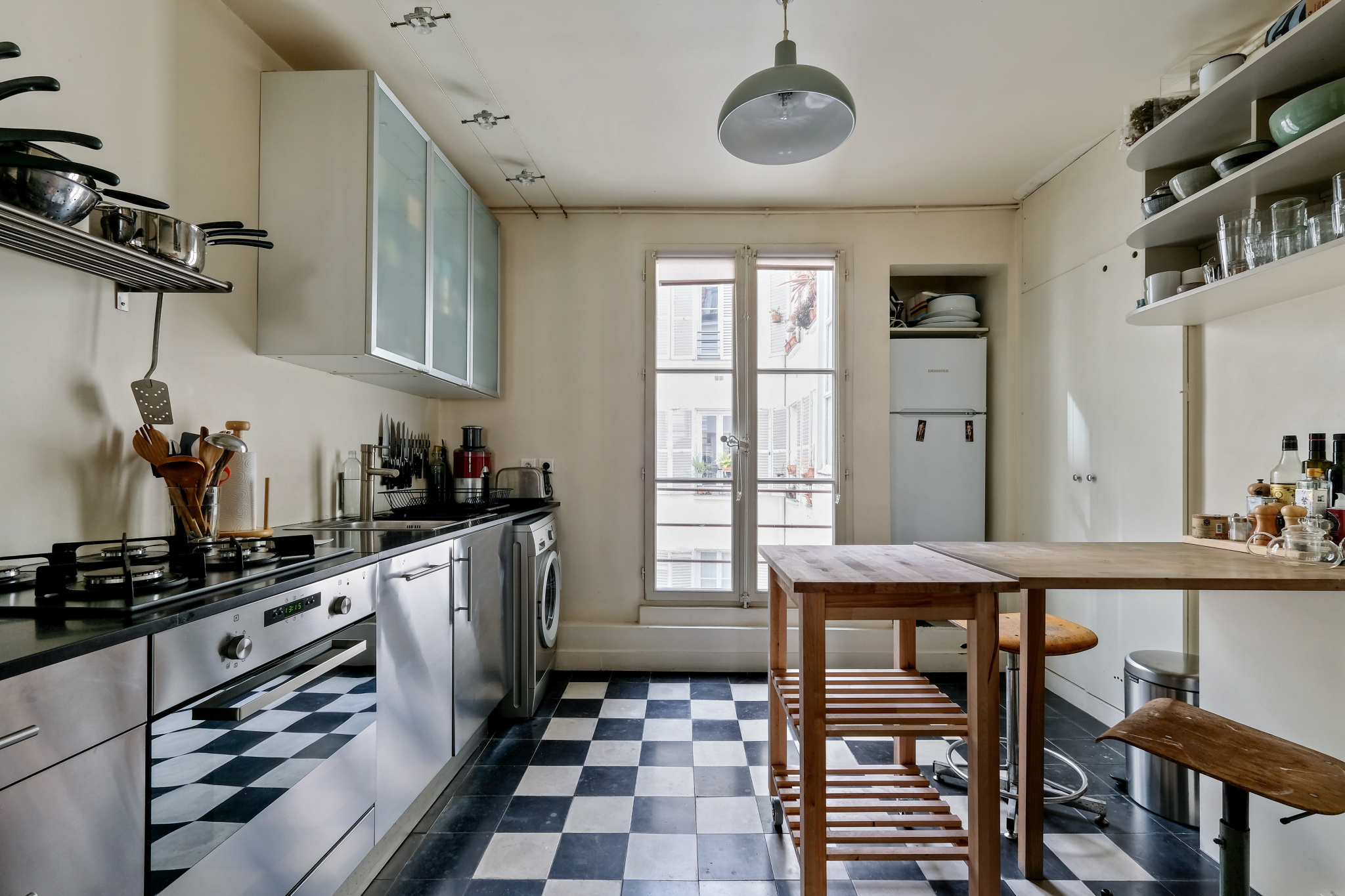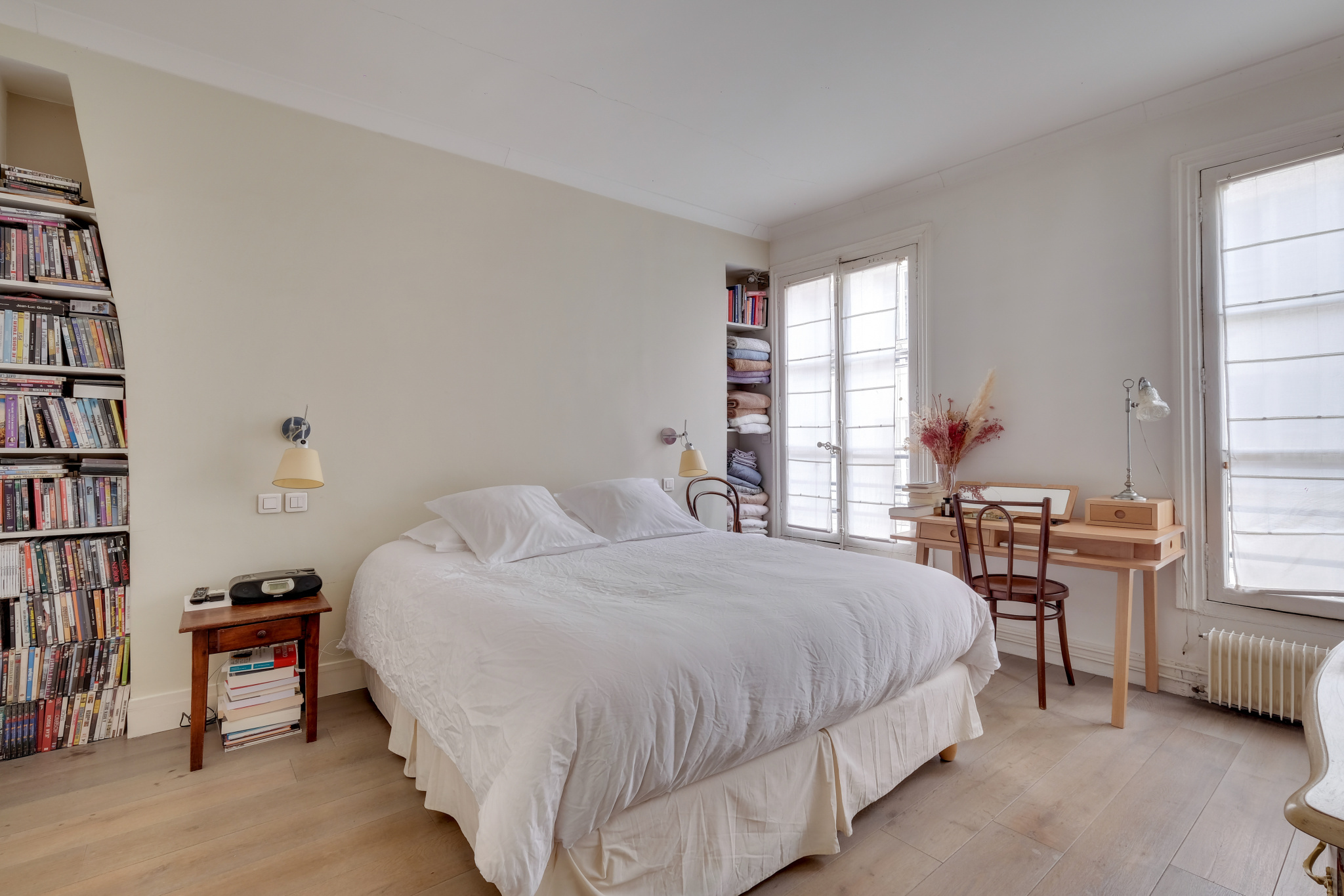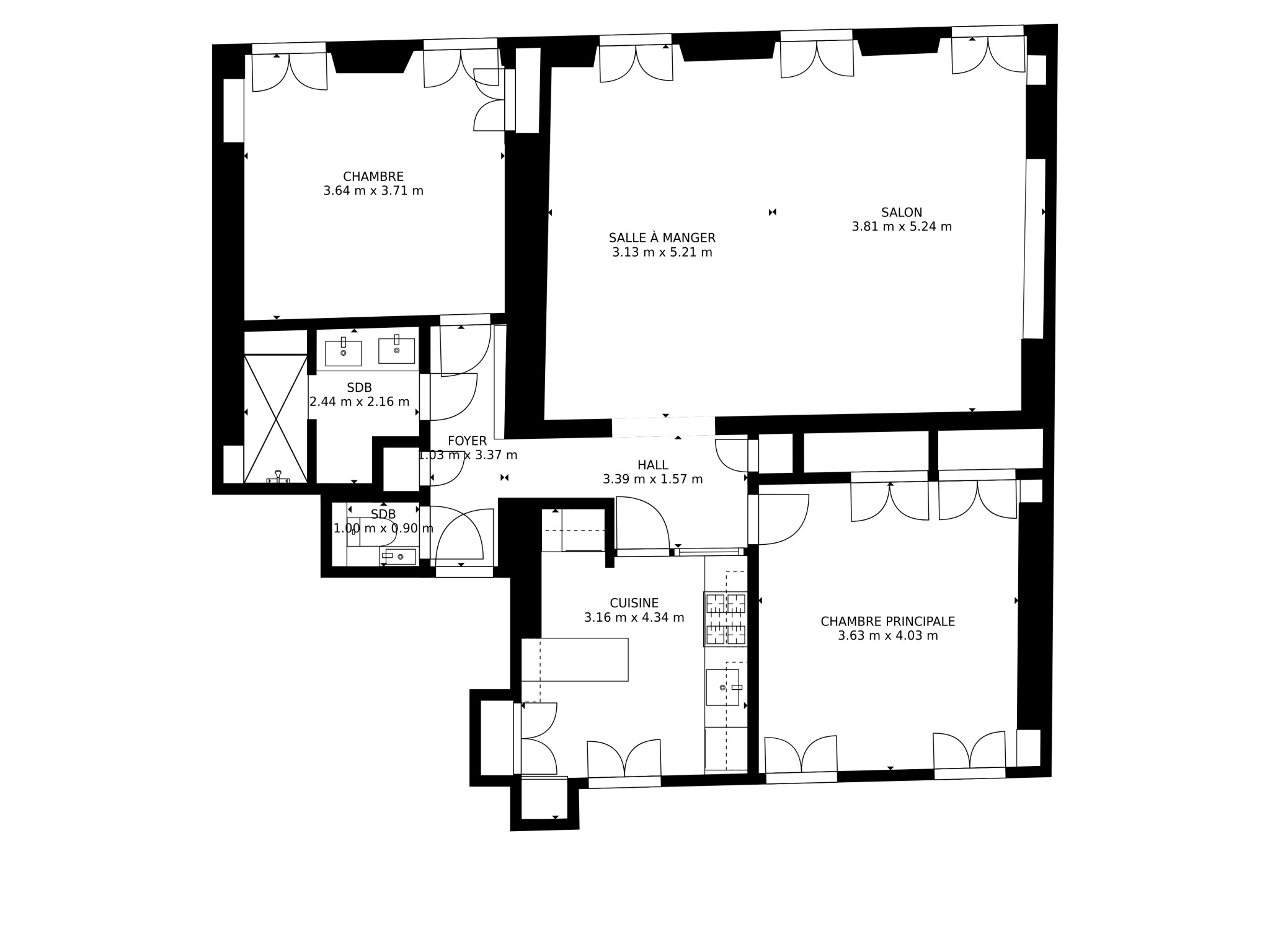 Il se compose d'une entrée en étoile , une cuisine dînatoire et sa verrière, une vaste double réception de 32m² , une chambre coté cour de 15m² , une chambre coté rue de 13m² , une salle de douche avec double vasque, un wc séparé.