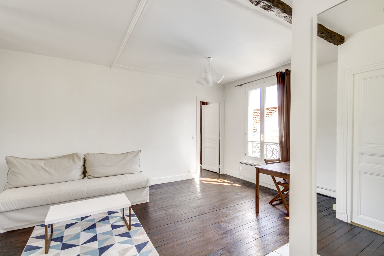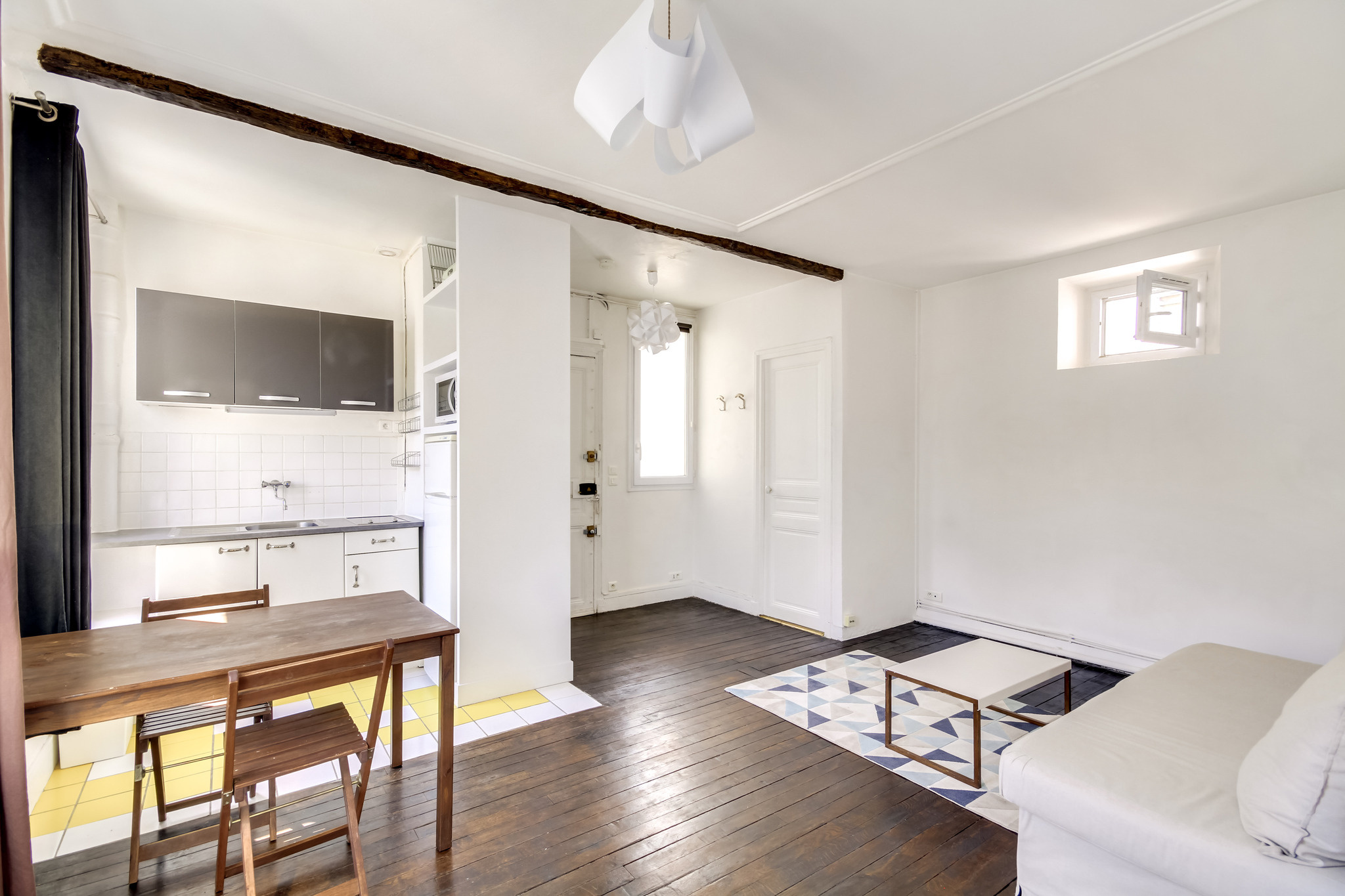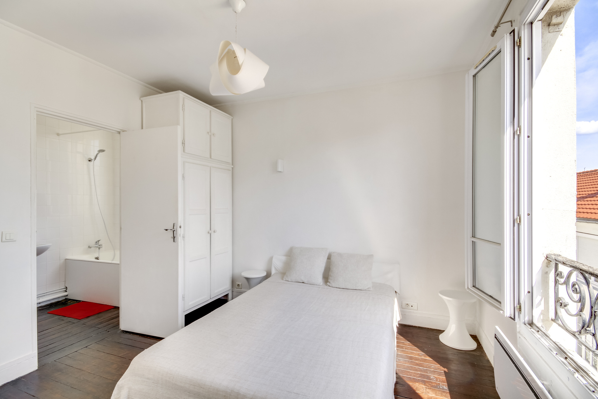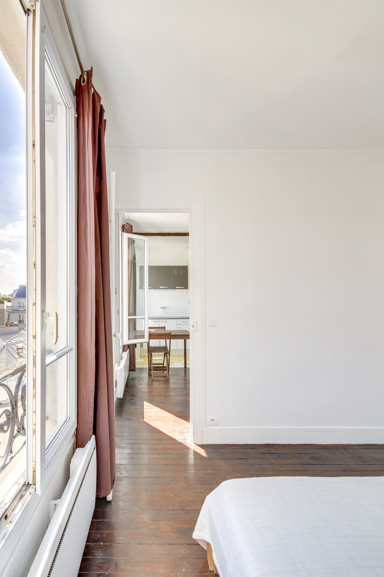 Il propose deux pièces principales et un plan parfaitement optimisé . Le séjour et sa cuisine ouverte mesurent 21m2 , la chambre 11m2 , la salle de bains propose une grande fenêtre et un dressing attenant , les wc sont séparés . L'appartement est en très bon état et possède du cachet grâce à son parquet ancien . Calme , soleil et dernier étage : produit rare .