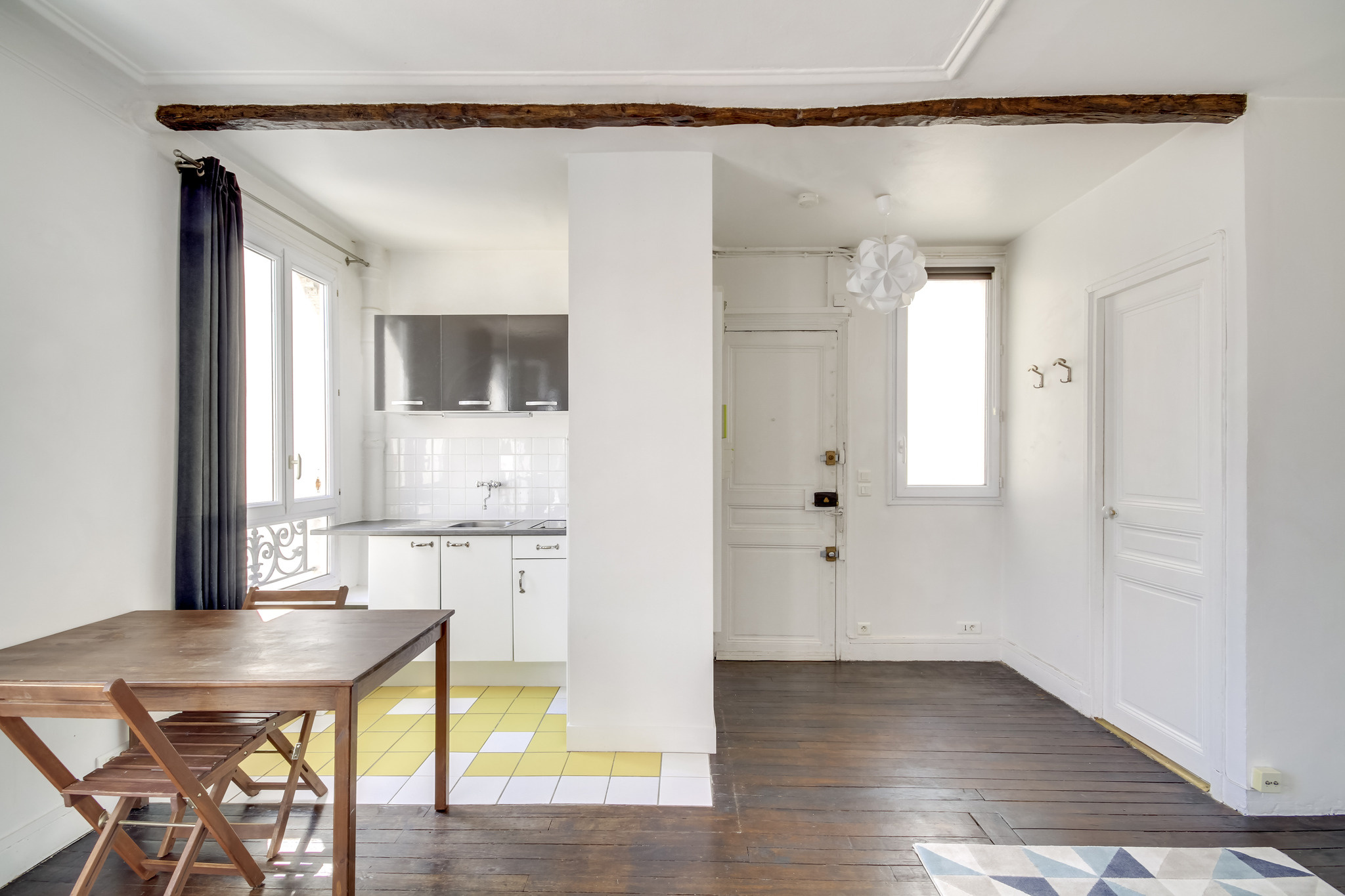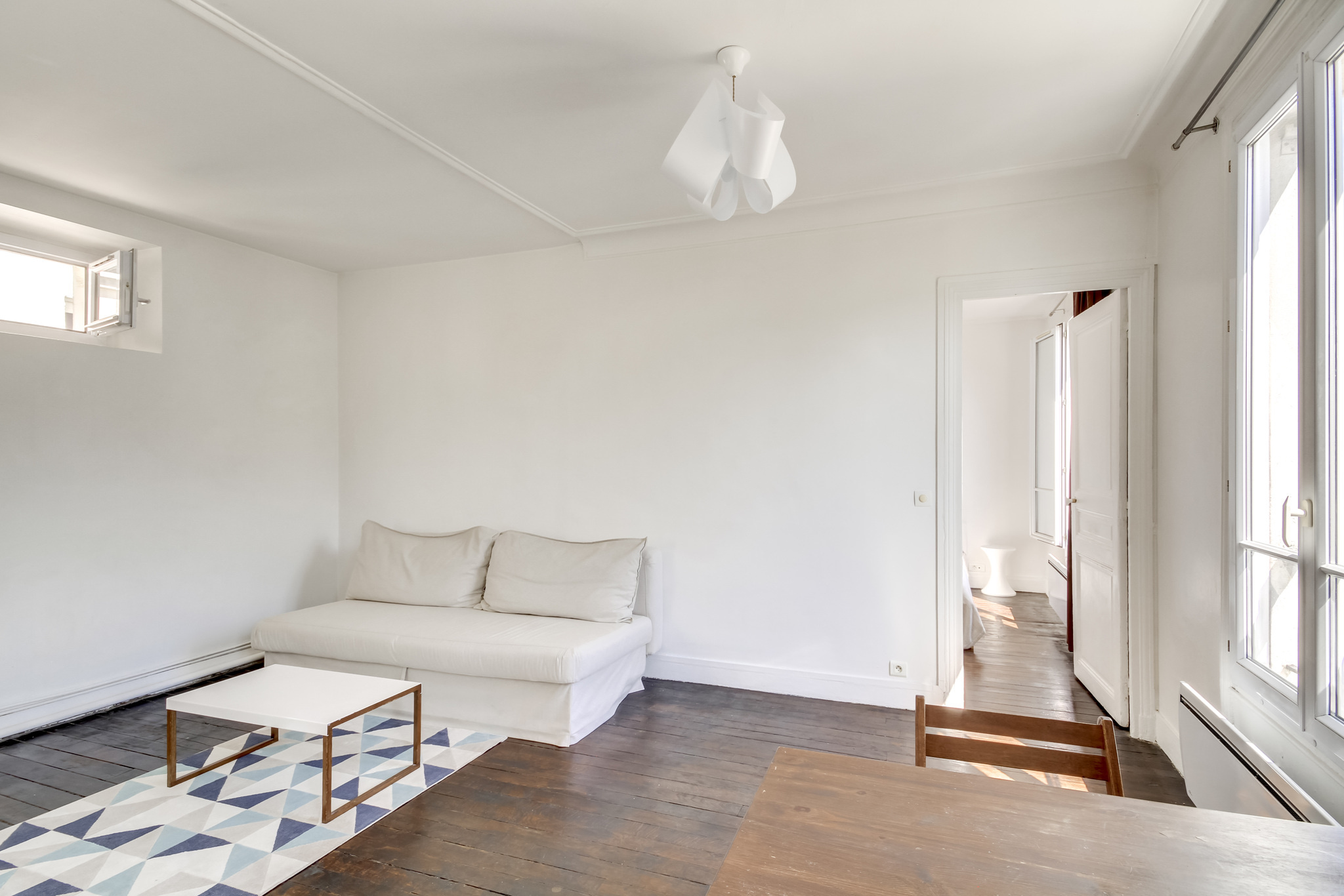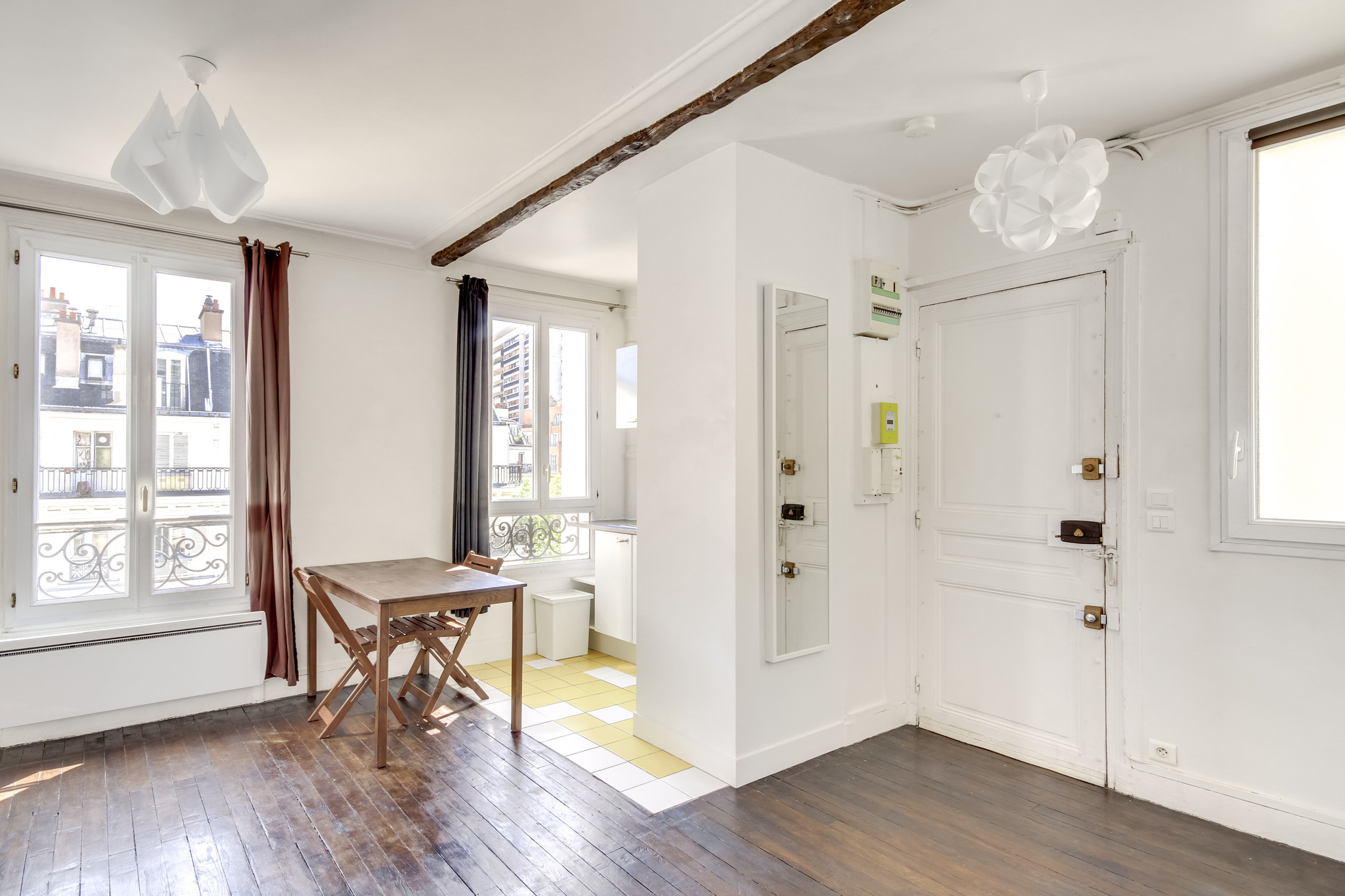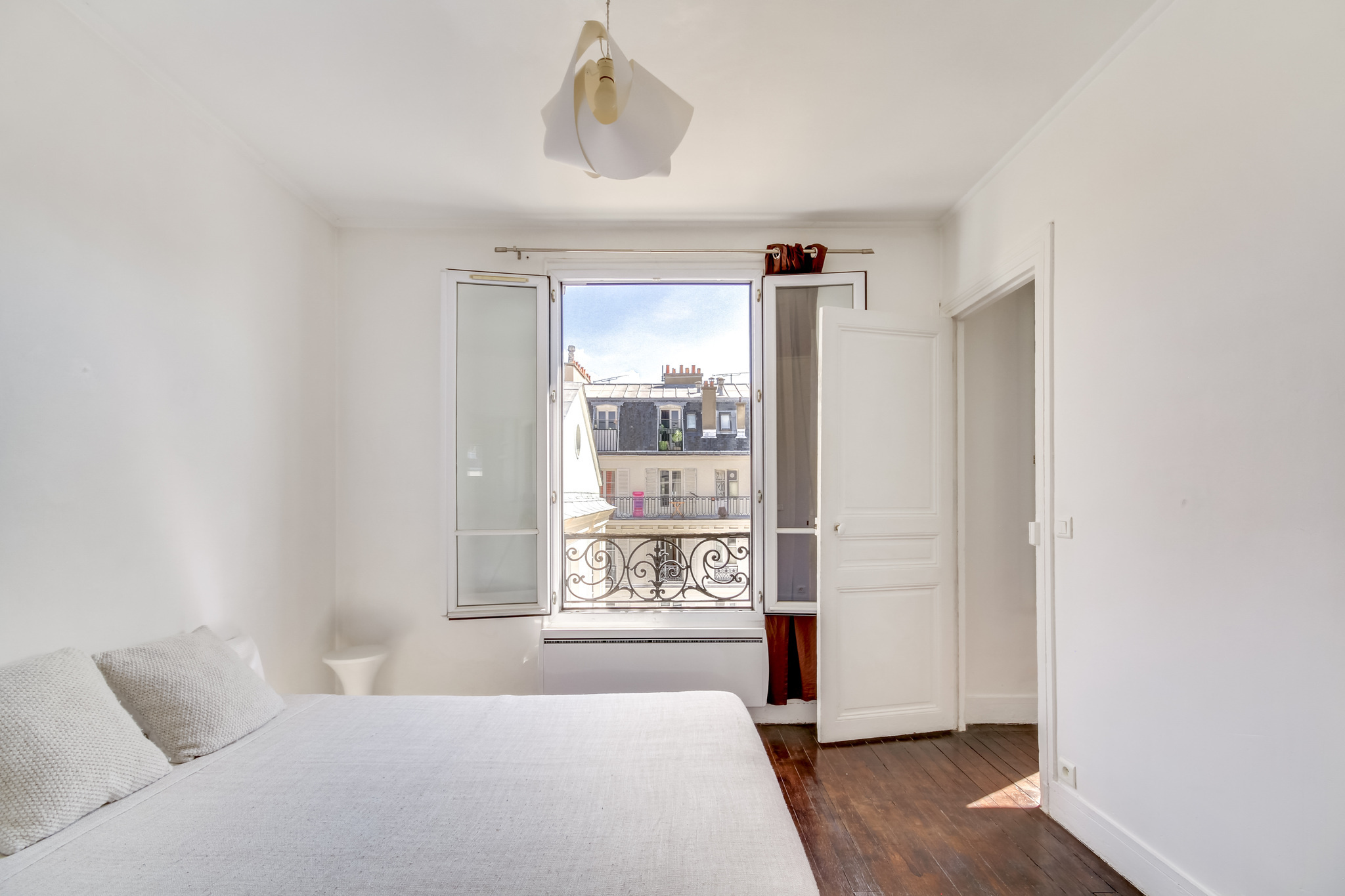Il propose deux pièces principales et un plan parfaitement optimisé . Le séjour et sa cuisine ouverte mesurent 21m2 , la chambre 11m2 , la salle de bains propose une grande fenêtre et un dressing attenant , les wc sont séparés . L'appartement est en très bon état et possède du cachet grâce à son parquet ancien . Calme , soleil et dernier étage : produit rare .